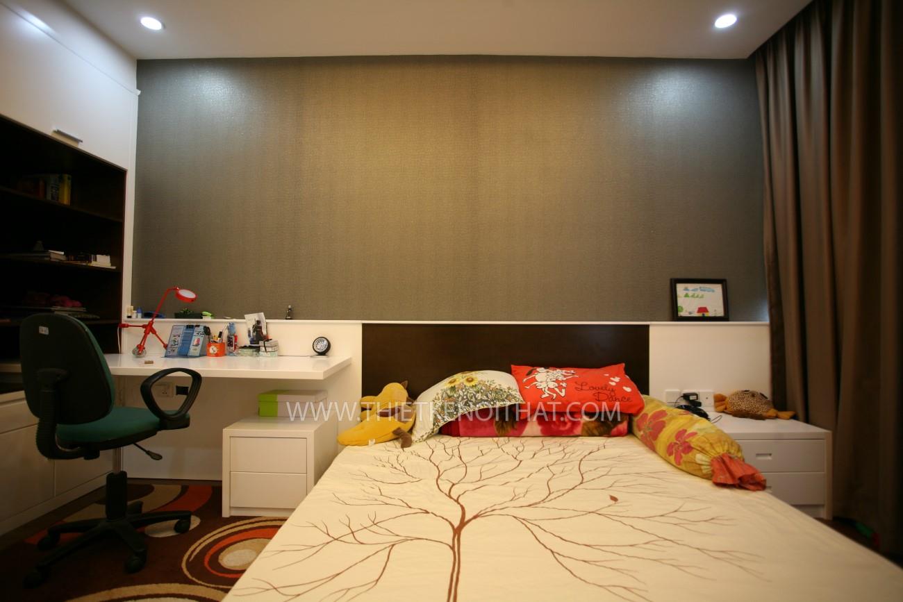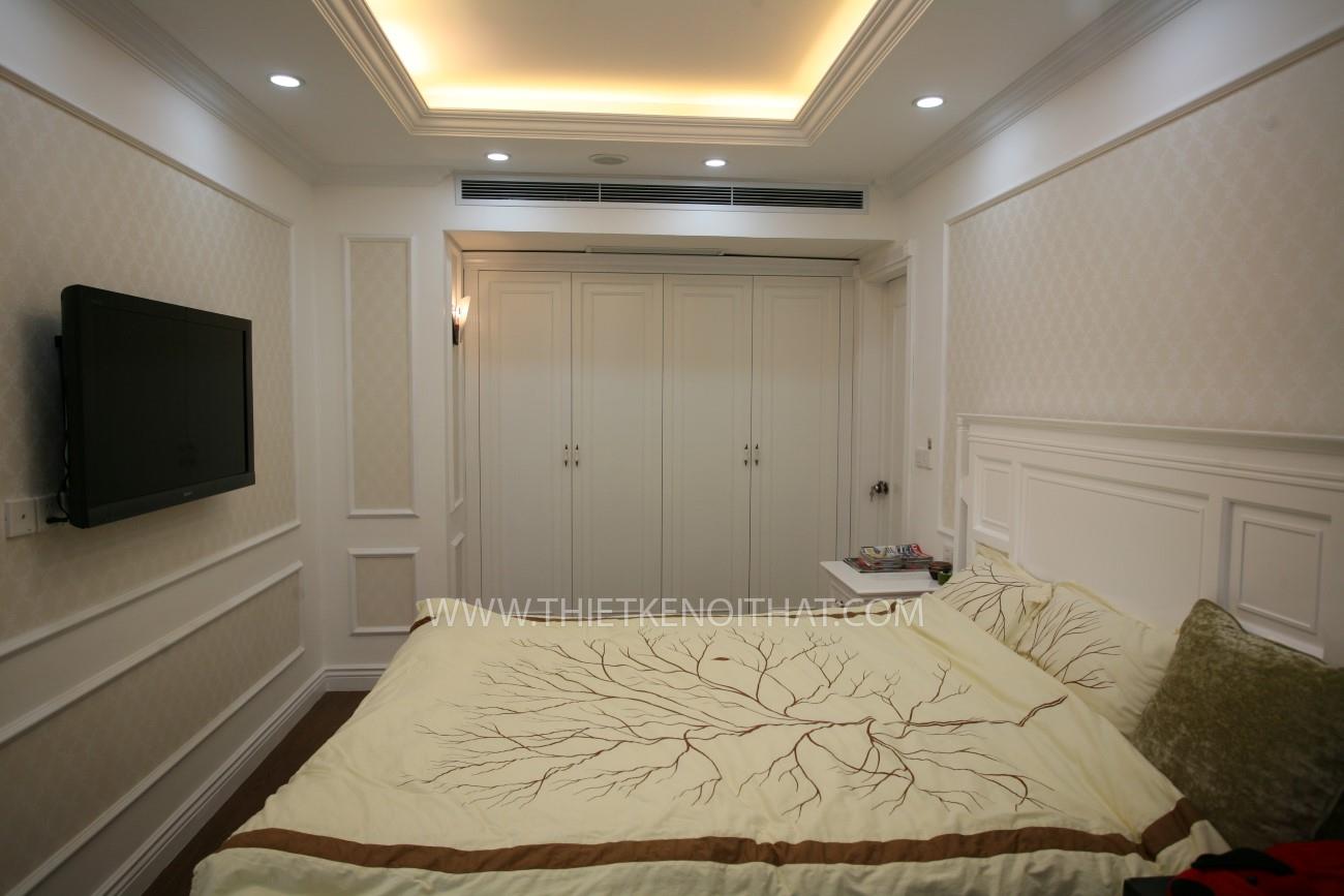 Tiếp theo là thiết kế nội thất phòng ngủ phong cách tân cổ điển. Trong quá trình thi công nội thất phòng ngủ, kiến trúc sư rất cẩn thận trong việc lựa chọn vật dụng. Ánh sáng là một trong những chi tiết quan trọng giúp mang đến sự thành công cho một công trình kiến trúc. Kính cường lực lớn, rộng trong suốt giúp không gian trở nên mở, tăng độ thoáng và tạo cảm giác cơi nới cho căn phòng. Bên cạnh đó, các chi tiết trang trí đậm chất tân cổ điển được kiến trúc sư khéo léo như giường tủ, đã giúp thể hiện tính đồng nhất và sự đồng bộ trong thiết kế.