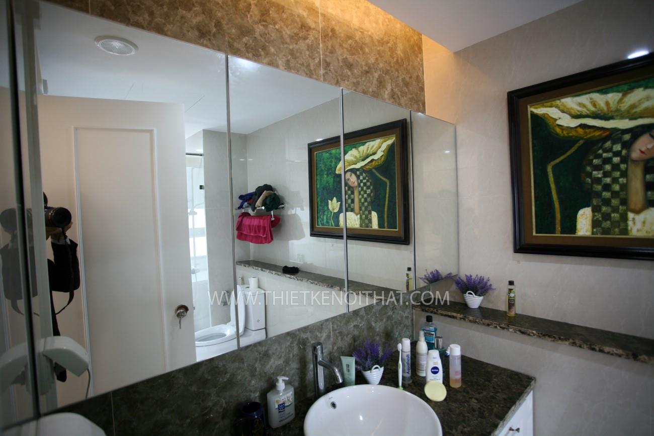 Cuối cùng là thi công nội thất phòng tắm và nhà vệ sinh hiện đại. Thiết kế phòng tắm chủ yếu sử dụng các vật liệu nhẹ như kính cường lực, gương phản chiếu, gạch men hay đá tự nhiên,… chính những vật liệu này với tính linh hoạt và độ phản chiếu nhất định đã góp phần giúp tạo độ tương phản cho ánh sáng, tạo cảm giác cơi nới cho không gian, tăng độ mở cho căn phòng nhỏ hẹp.