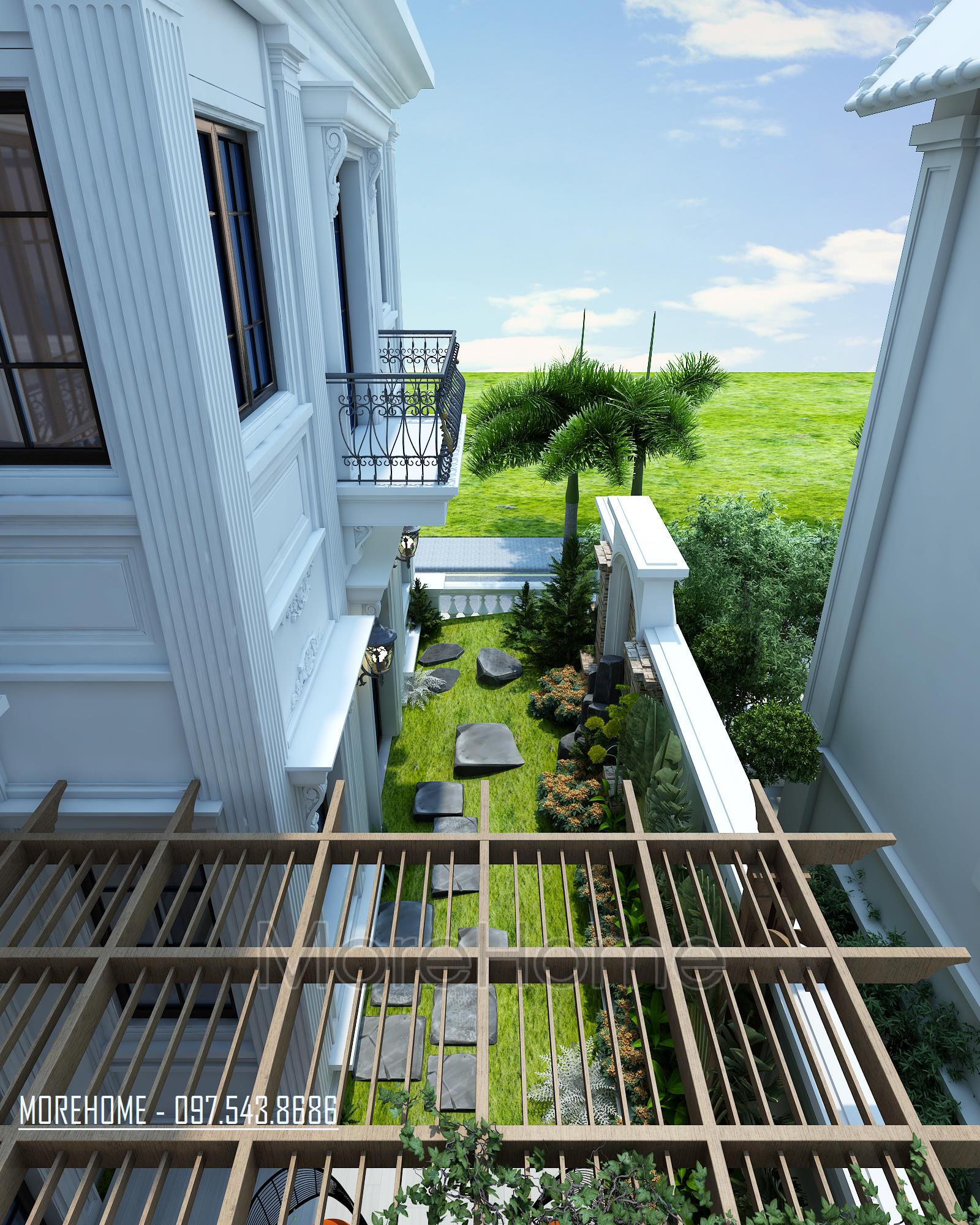 Không gian thiết kế xanh bao quanh căn nhà, kéo dài và ôm trọn căn biệt thự góp phần lớn tạo độ thoáng và phân chia không gian hợp lý hơn. Với các căn nhà trong thành phố, diện tích bao thường rất hẹp, gây ra một cảm giác khó chịu và khá tối tăm, thường sẽ là điểm xấu ảnh hưởng đến thẩm mỹ của căn nhà, tuy nhiên với thiết kế biệt thự tân cổ điển này, không gian bao quanh đủ rộng kết hợp hài hòa với không gian và tạo thêm điểm nhấn trong thiết kế cảnh quan biệt thự.