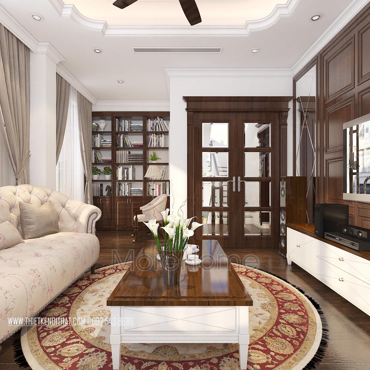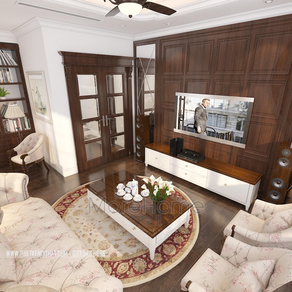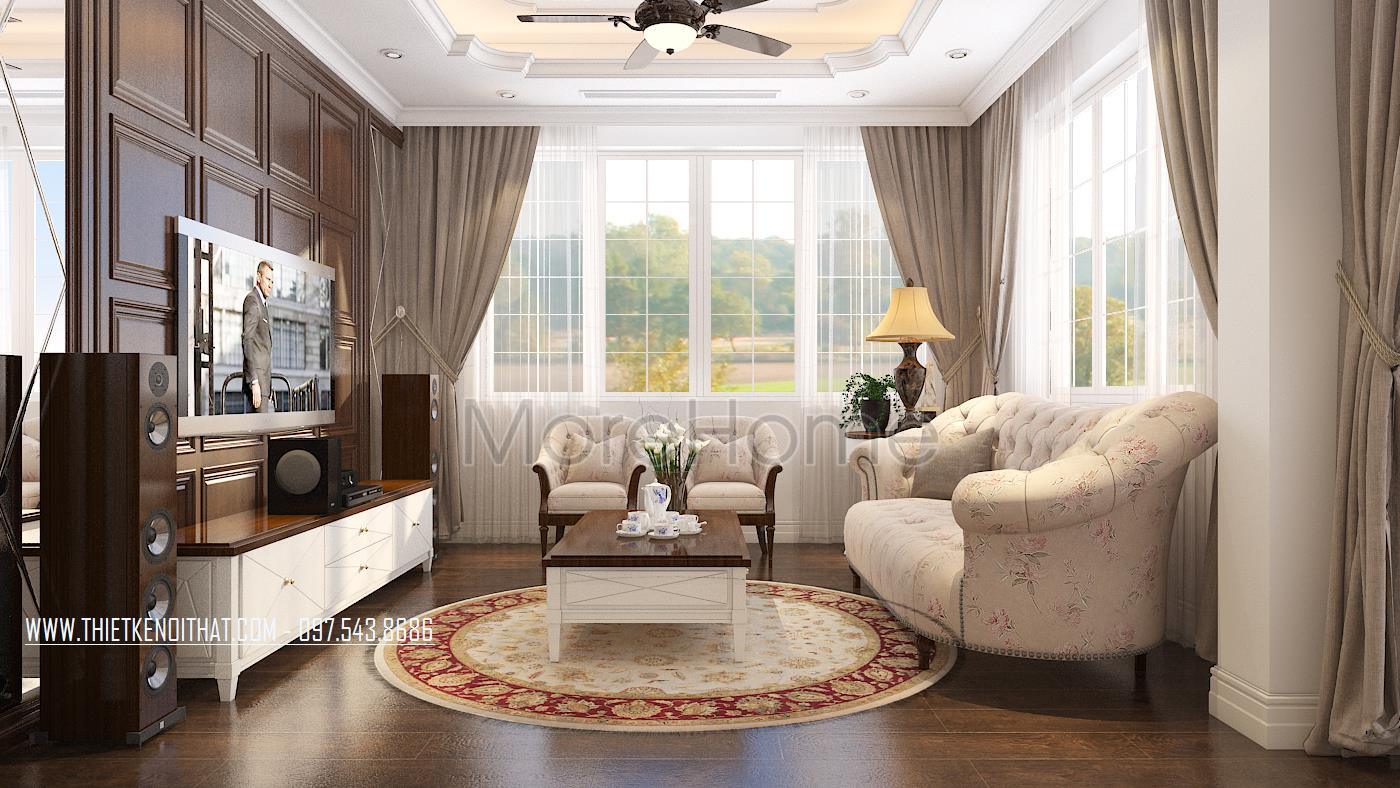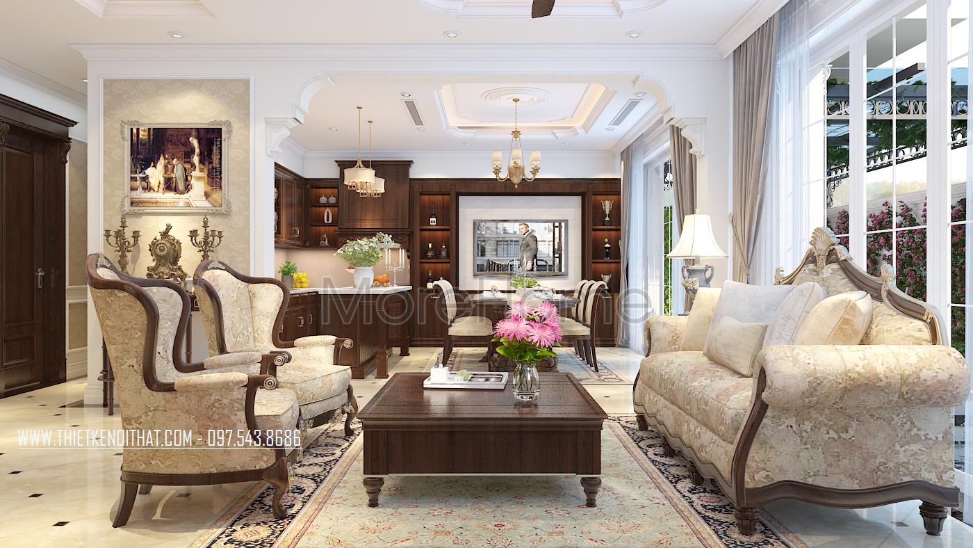 Thiết kế này không chỉ làm nổi bật vẻ đẹp tinh tế mà còn góp phần thể hiện cái Tôi và sở thích của gia chủ. Thiết kế nội thất phòng khách mang đến cho chúng ta cảm giác dễ chịu và gần gũi. Cảm giác này có được là do hiệu ứng màu sắc đem lại. Với thiết kế nhấn mạnh vào các đường cong tinh tế và cầu kỳ, kiến trúc sư dễ dàng mang đến một không gian kiến trúc mềm mại, đậm chất châu Âu cổ điển. Bên cạnh đó, với việc sử dụng tone màu vàng nâu và veneer nâu của gỗ giúp không gian trở nên đồng bộ, thống nhất, góp phần khắc họa rõ thiết kế phong cách tân cổ điển.