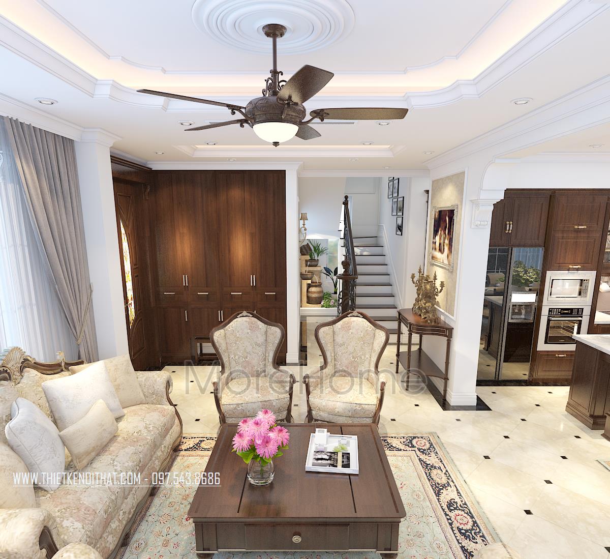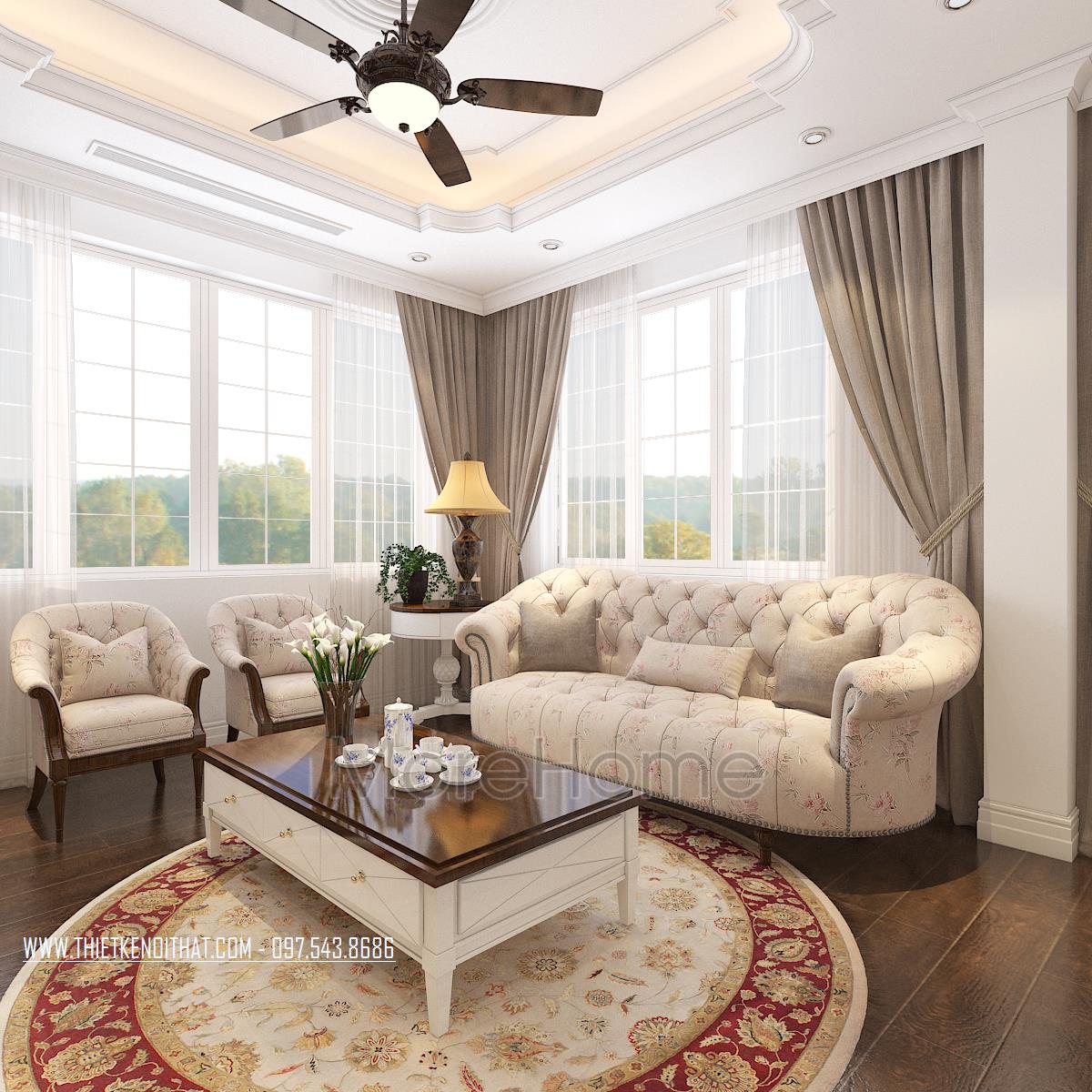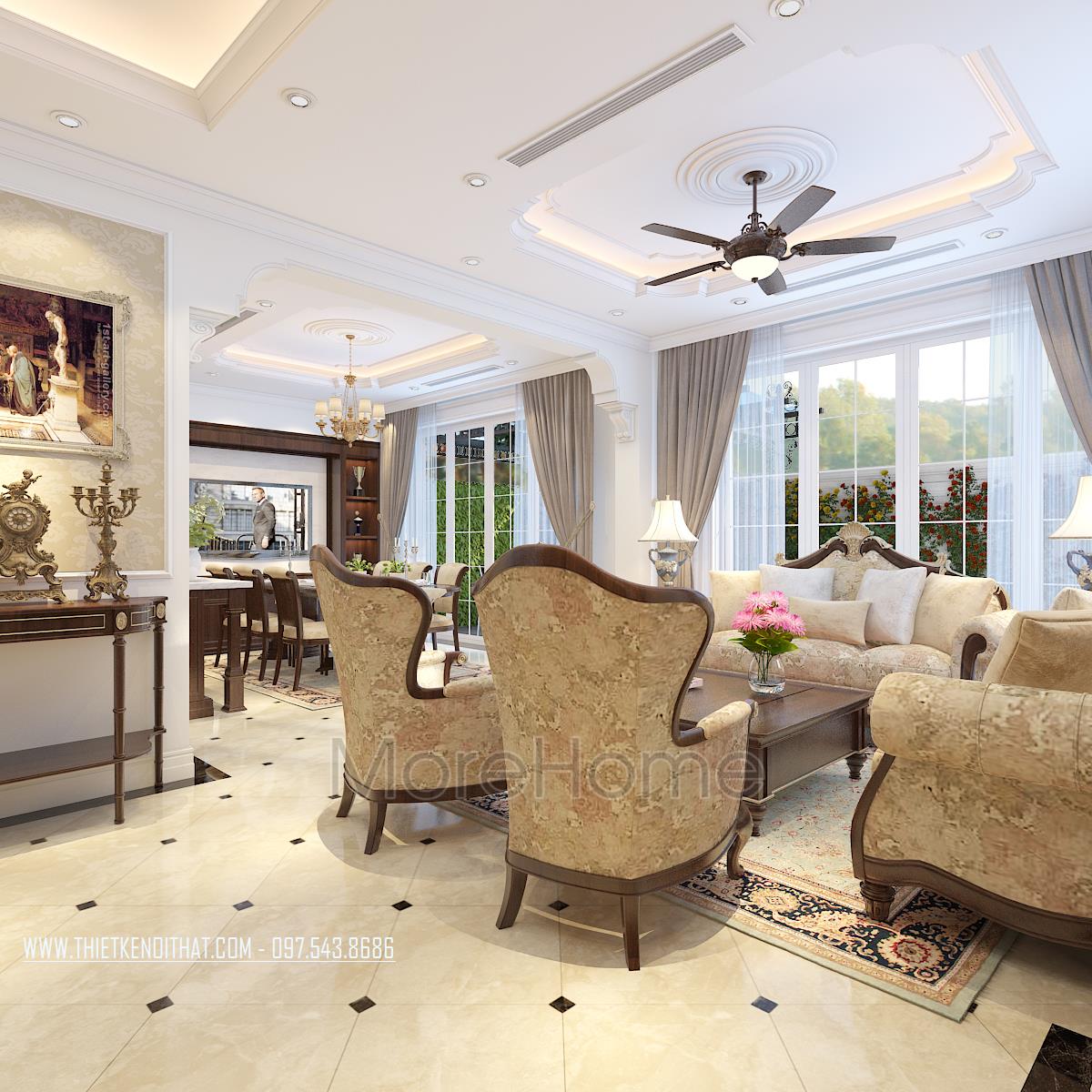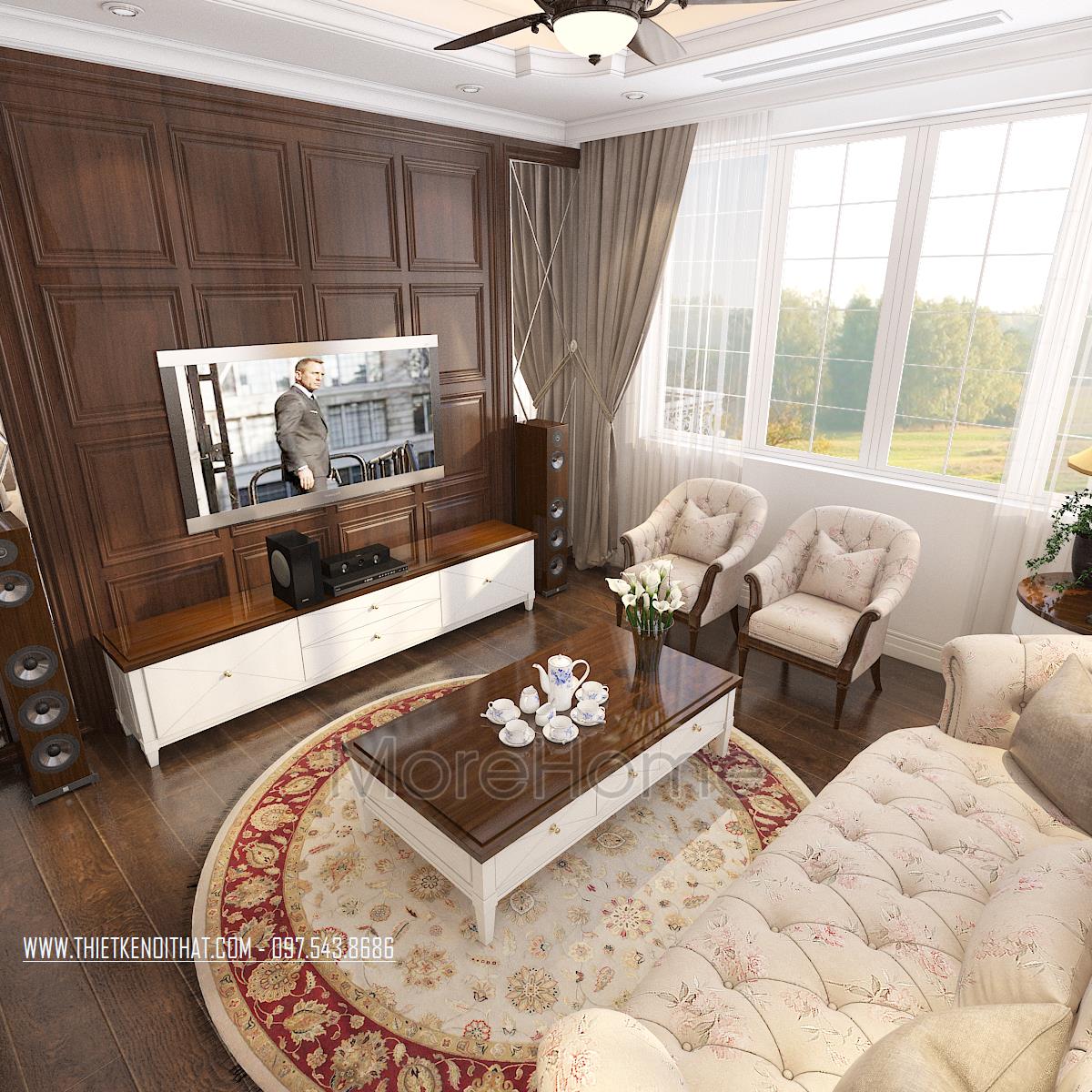 Thiết kế này không chỉ làm nổi bật vẻ đẹp tinh tế mà còn góp phần thể hiện cái Tôi và sở thích của gia chủ. Thiết kế nội thất phòng khách mang đến cho chúng ta cảm giác dễ chịu và gần gũi. Cảm giác này có được là do hiệu ứng màu sắc đem lại. Với thiết kế nhấn mạnh vào các đường cong tinh tế và cầu kỳ, kiến trúc sư dễ dàng mang đến một không gian kiến trúc mềm mại, đậm chất châu Âu cổ điển. Bên cạnh đó, với việc sử dụng tone màu vàng nâu và veneer nâu của gỗ giúp không gian trở nên đồng bộ, thống nhất, góp phần khắc họa rõ thiết kế phong cách tân cổ điển.
