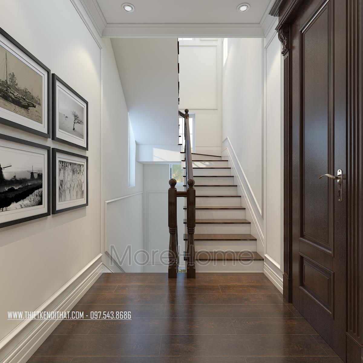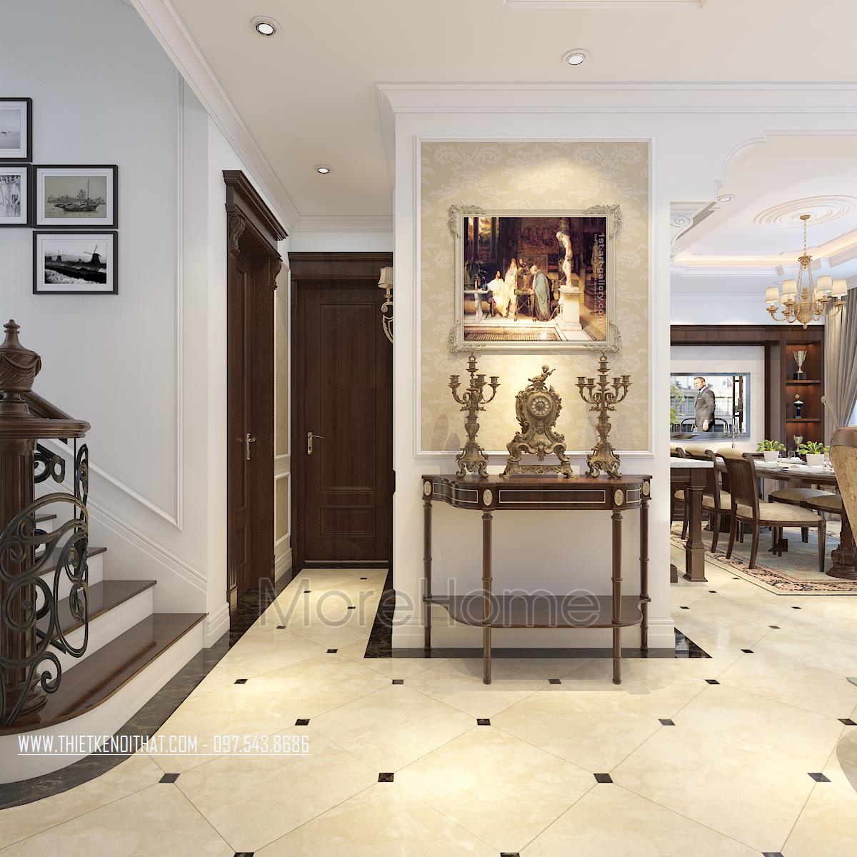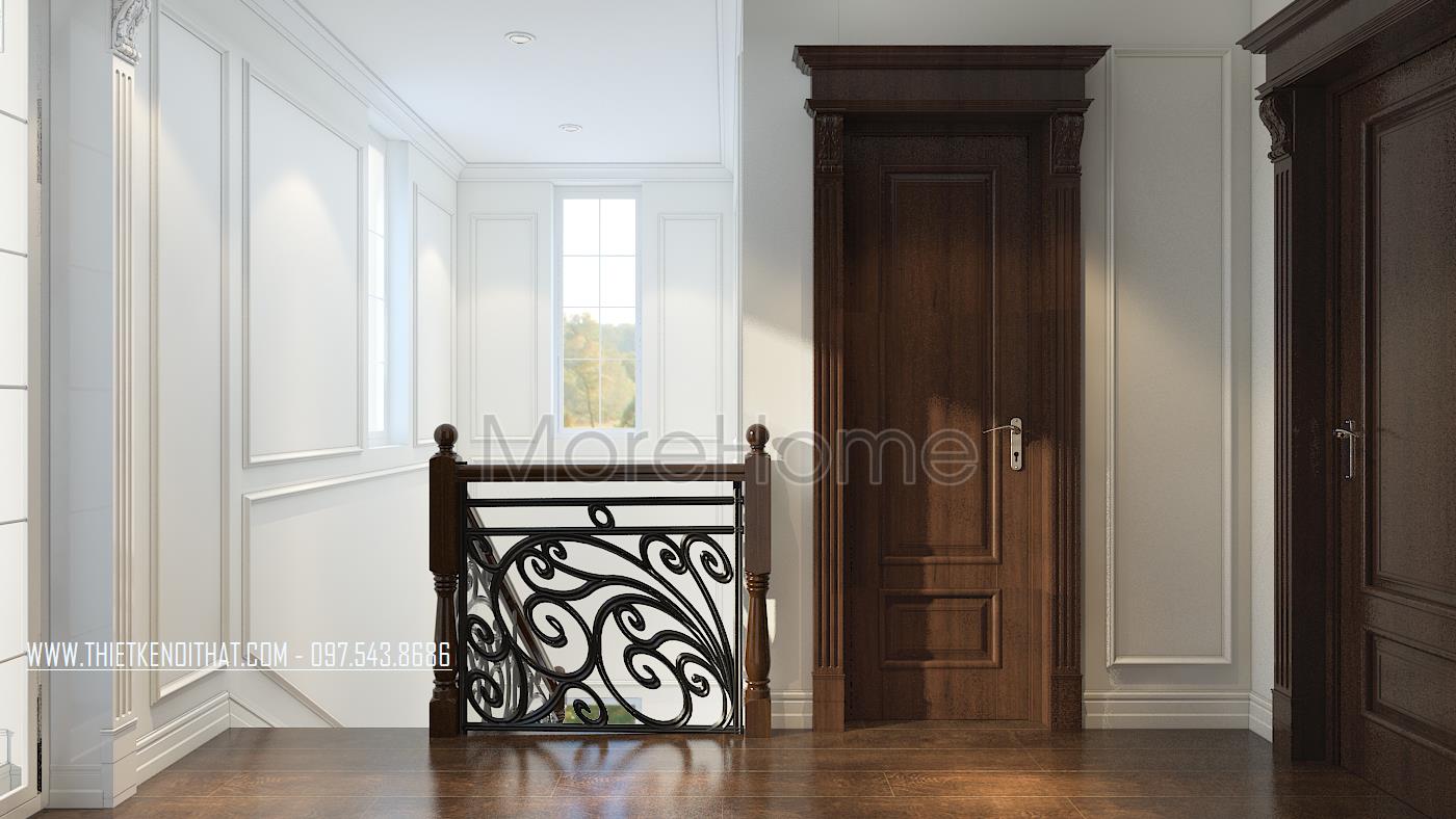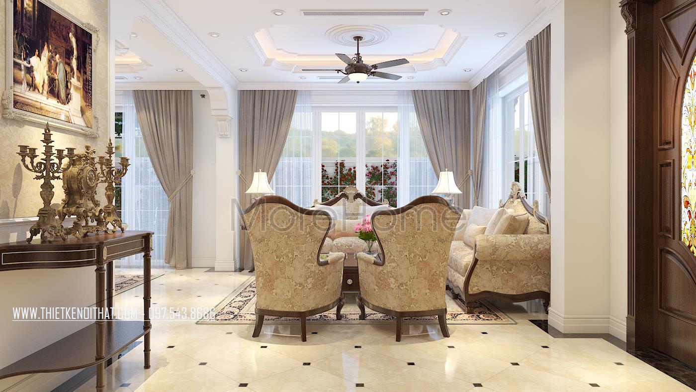 Bên cạnh đó, thiết kế tân cổ điển còn rất phù hợp với các căn biệt thự xa hoa, phô được vẻ đẹp về không gian mà không làm ảnh hưởng đến diện tích sử dụng. Ngoài các yếu tố liên quan đến đường nét, thì ánh sáng và màu sắc cũng góp phần lớn đến sự thành công của 1 công trình kiến trúc. Bằng việc sử dụng các thiết kế tone màu nhẹ, nổi bật và điểm xuyết các thiết kế nâu veneer của gỗ hay màu vàng kim sang trọng, kiến trúc sư đã khéo léo mang không khí cổ kính của Châu Âu vào trong từng góc của căn nhà.