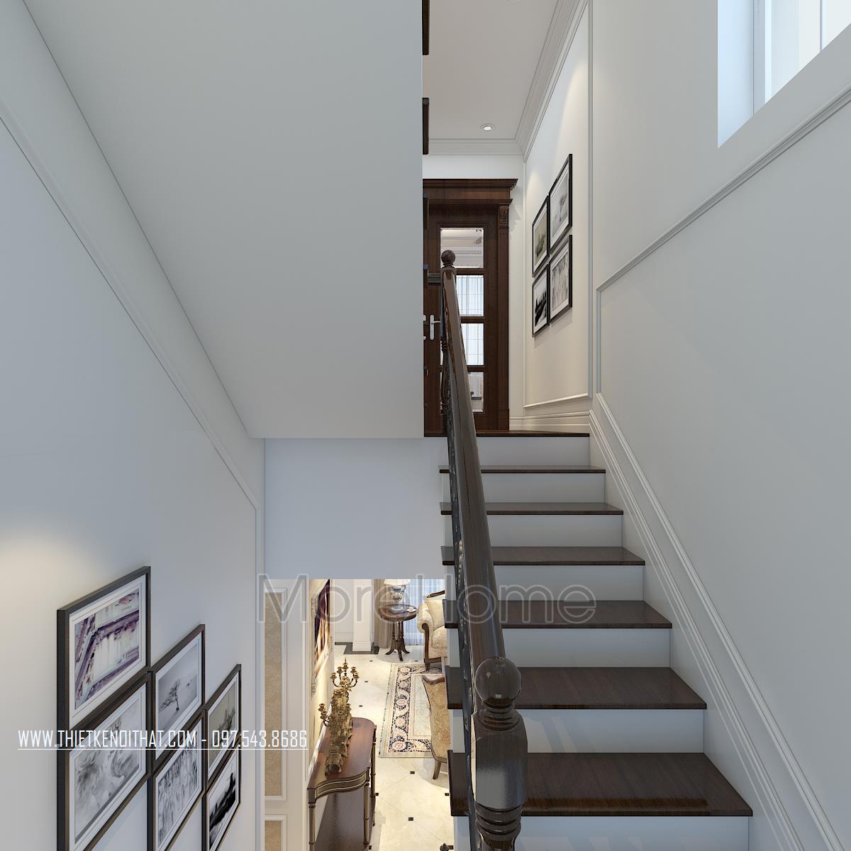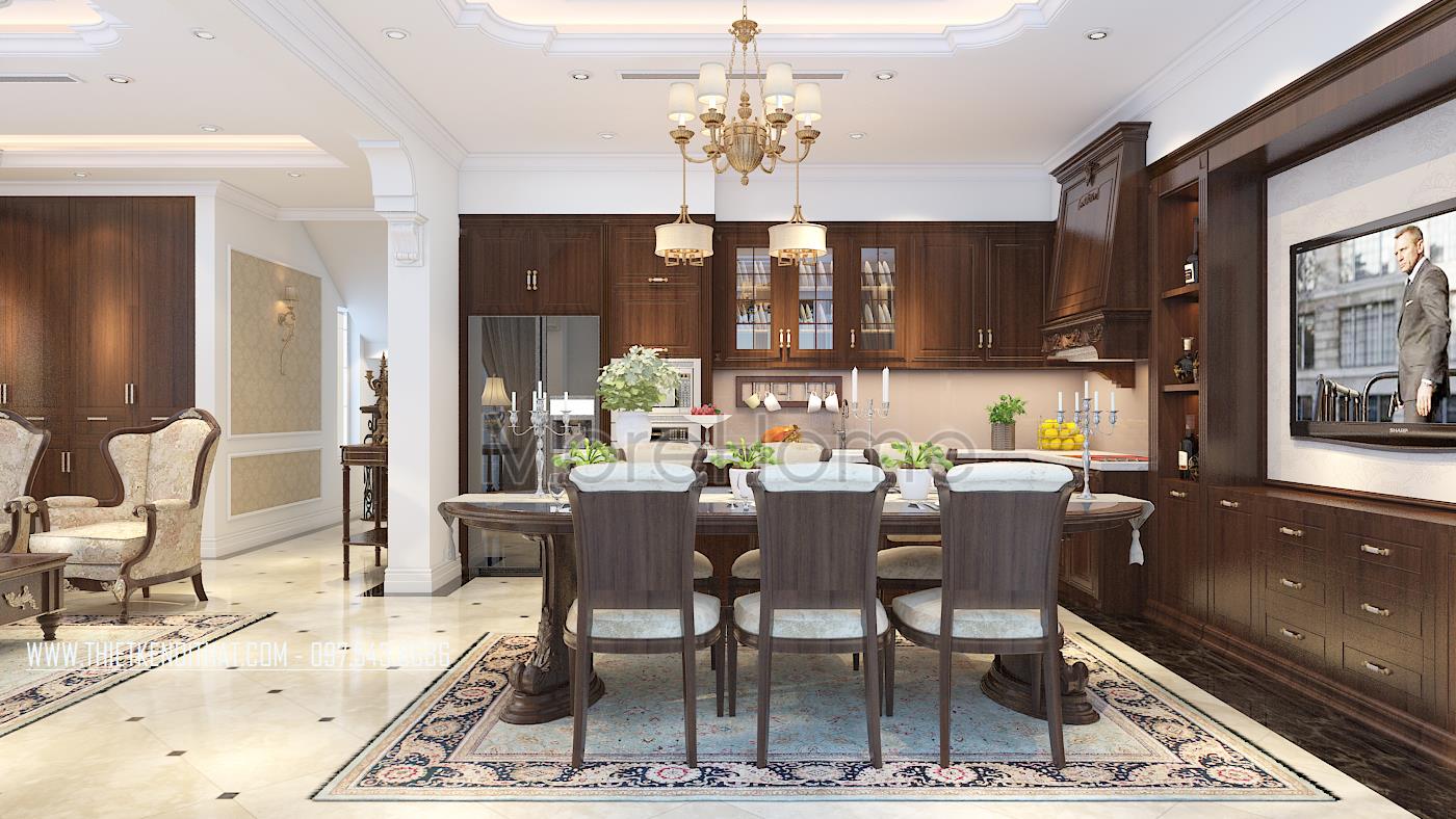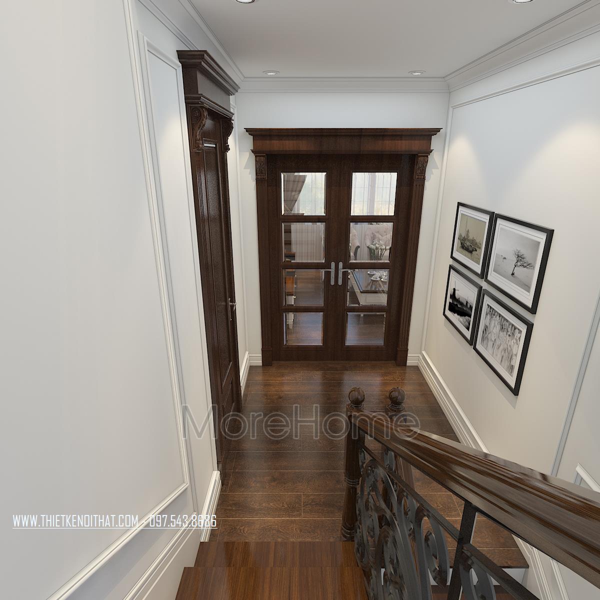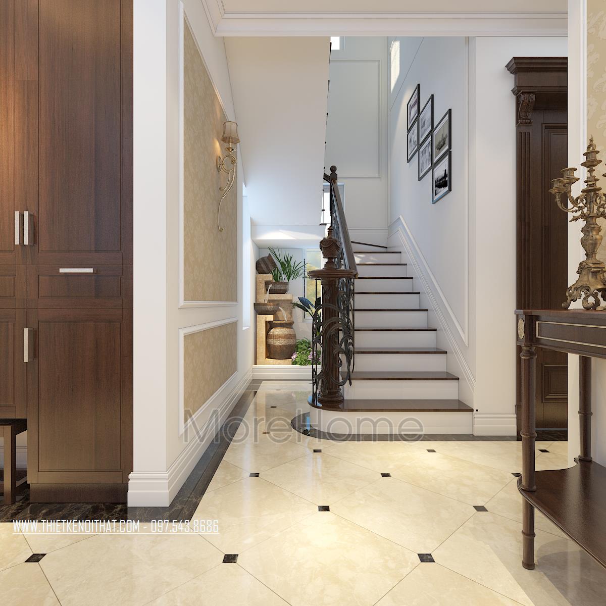 Bên cạnh đó, thiết kế tân cổ điển còn rất phù hợp với các căn biệt thự xa hoa, phô được vẻ đẹp về không gian mà không làm ảnh hưởng đến diện tích sử dụng. Ngoài các yếu tố liên quan đến đường nét, thì ánh sáng và màu sắc cũng góp phần lớn đến sự thành công của 1 công trình kiến trúc. Bằng việc sử dụng các thiết kế tone màu nhẹ, nổi bật và điểm xuyết các thiết kế nâu veneer của gỗ hay màu vàng kim sang trọng, kiến trúc sư đã khéo léo mang không khí cổ kính của Châu Âu vào trong từng góc của căn nhà.