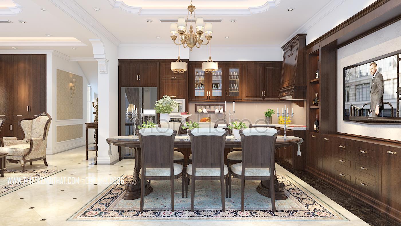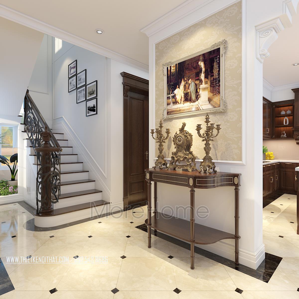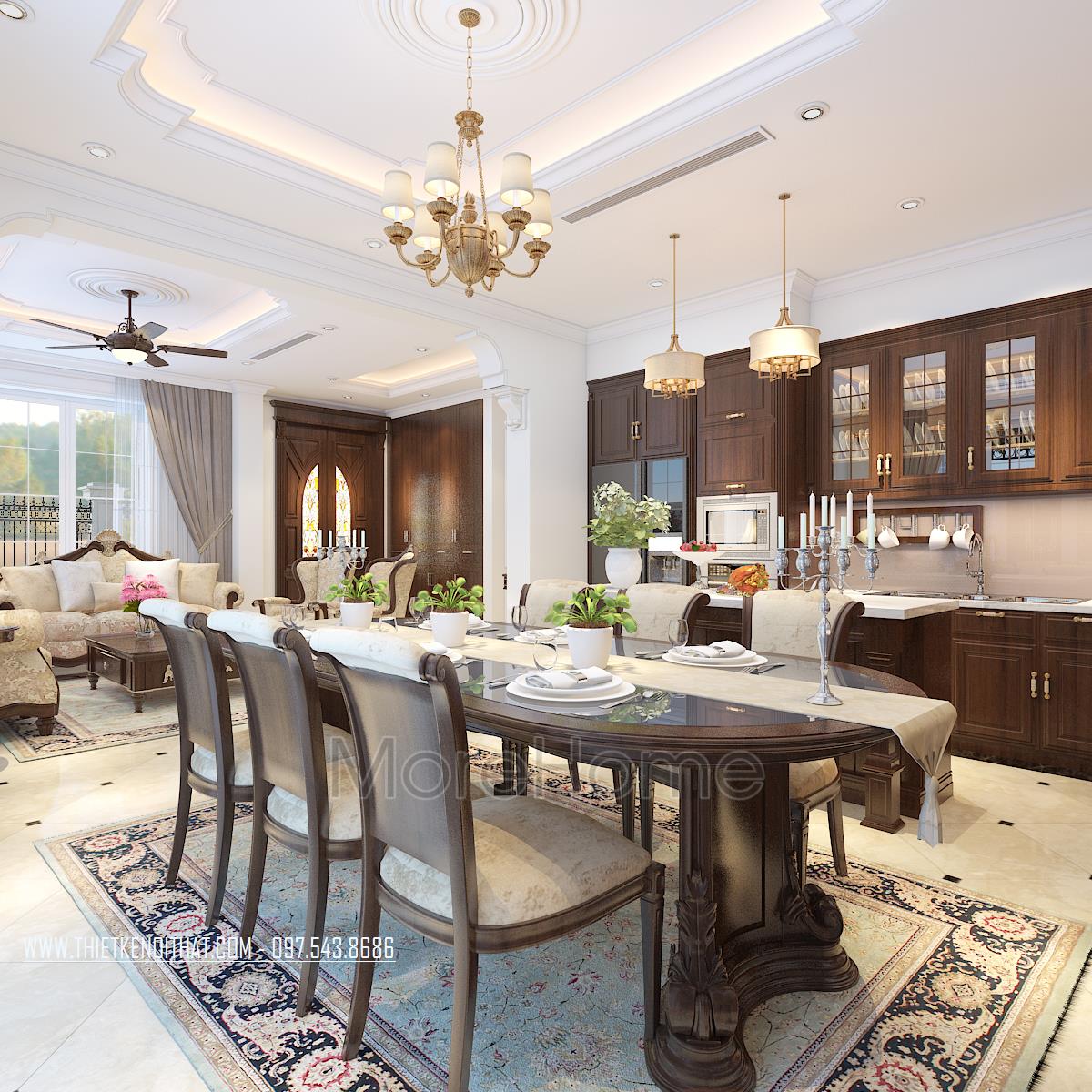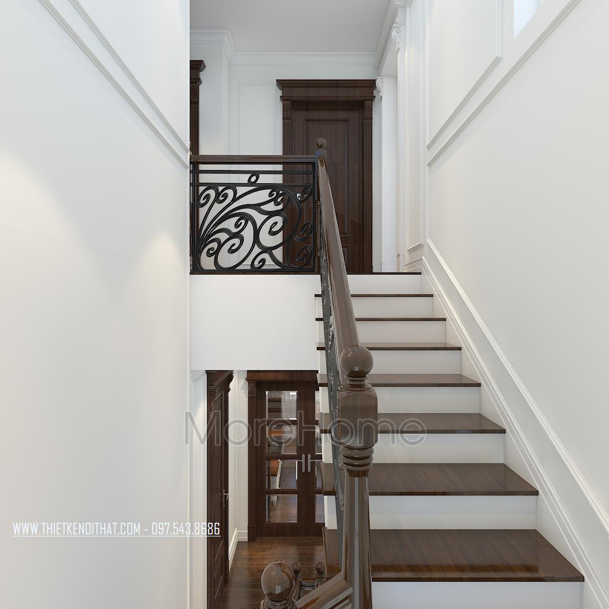 Bên cạnh đó, thiết kế tân cổ điển còn rất phù hợp với các căn biệt thự xa hoa, phô được vẻ đẹp về không gian mà không làm ảnh hưởng đến diện tích sử dụng. Ngoài các yếu tố liên quan đến đường nét, thì ánh sáng và màu sắc cũng góp phần lớn đến sự thành công của 1 công trình kiến trúc. Bằng việc sử dụng các thiết kế tone màu nhẹ, nổi bật và điểm xuyết các thiết kế nâu veneer của gỗ hay màu vàng kim sang trọng, kiến trúc sư đã khéo léo mang không khí cổ kính của Châu Âu vào trong từng góc của căn nhà.