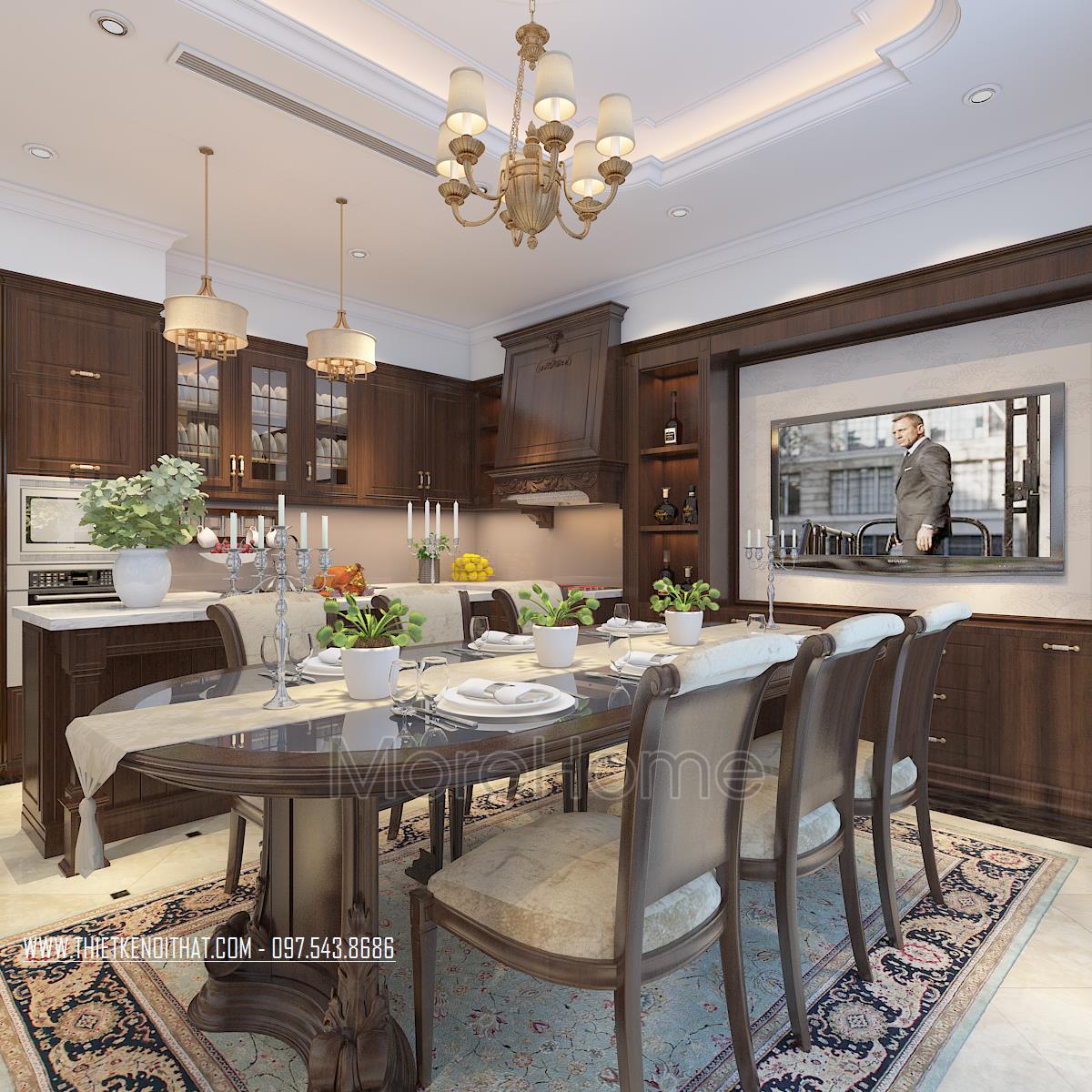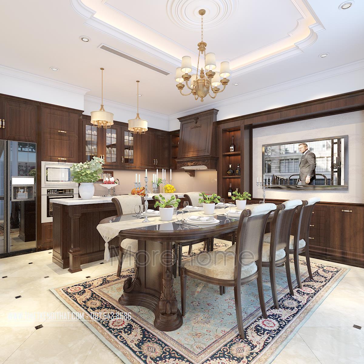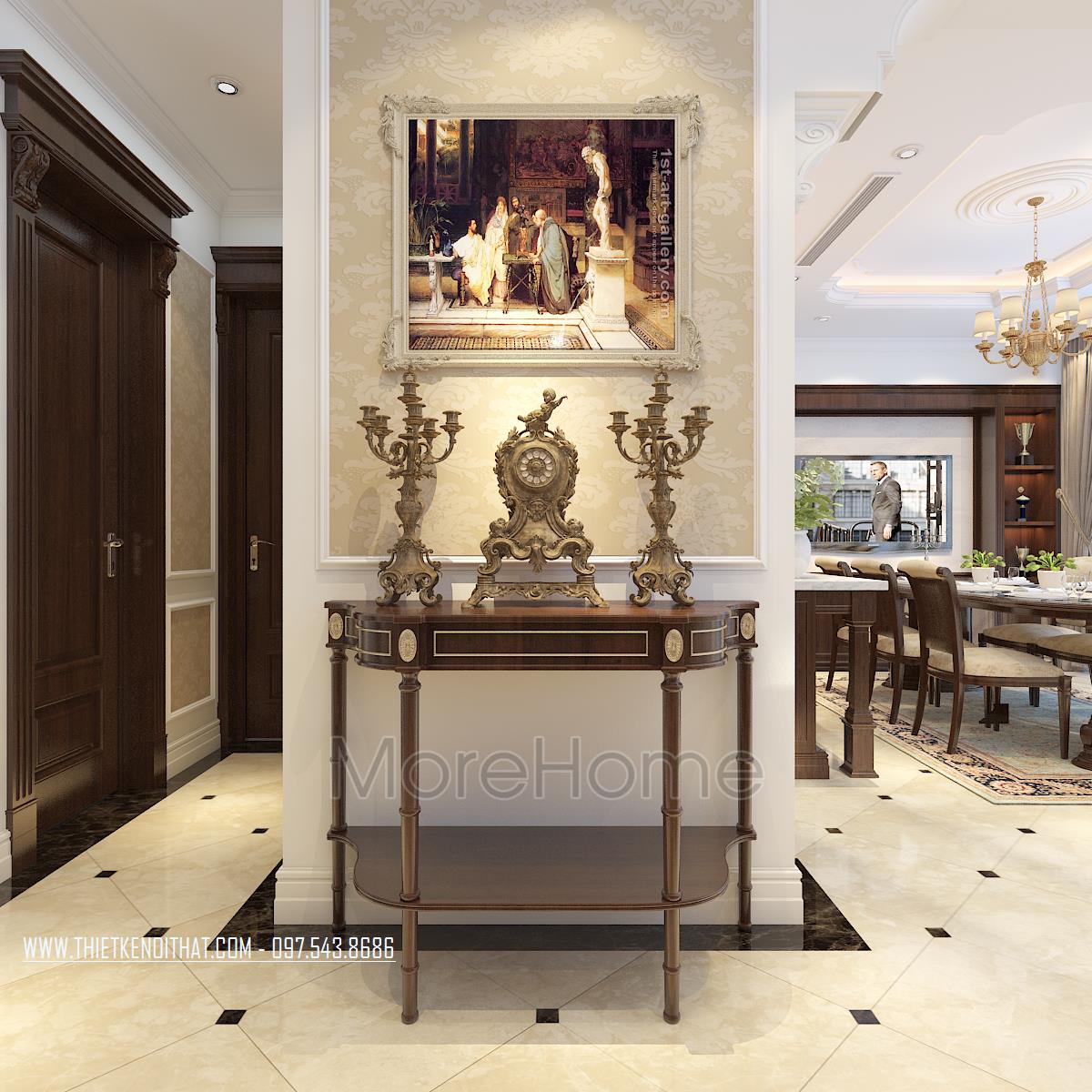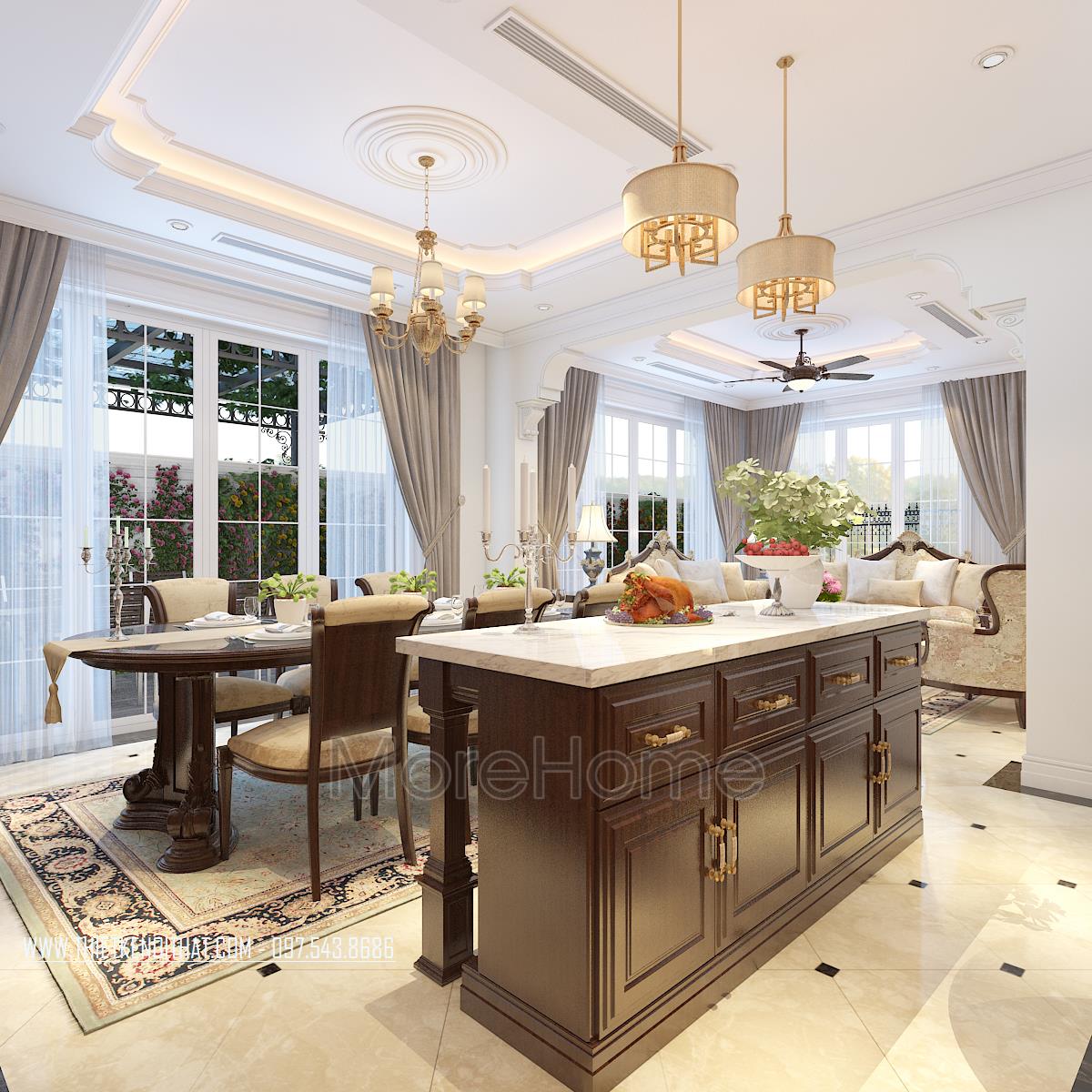 Bên cạnh đó, thiết kế tân cổ điển còn rất phù hợp với các căn biệt thự xa hoa, phô được vẻ đẹp về không gian mà không làm ảnh hưởng đến diện tích sử dụng. Ngoài các yếu tố liên quan đến đường nét, thì ánh sáng và màu sắc cũng góp phần lớn đến sự thành công của 1 công trình kiến trúc. Bằng việc sử dụng các thiết kế tone màu nhẹ, nổi bật và điểm xuyết các thiết kế nâu veneer của gỗ hay màu vàng kim sang trọng, kiến trúc sư đã khéo léo mang không khí cổ kính của Châu Âu vào trong từng góc của căn nhà.