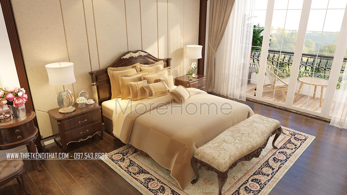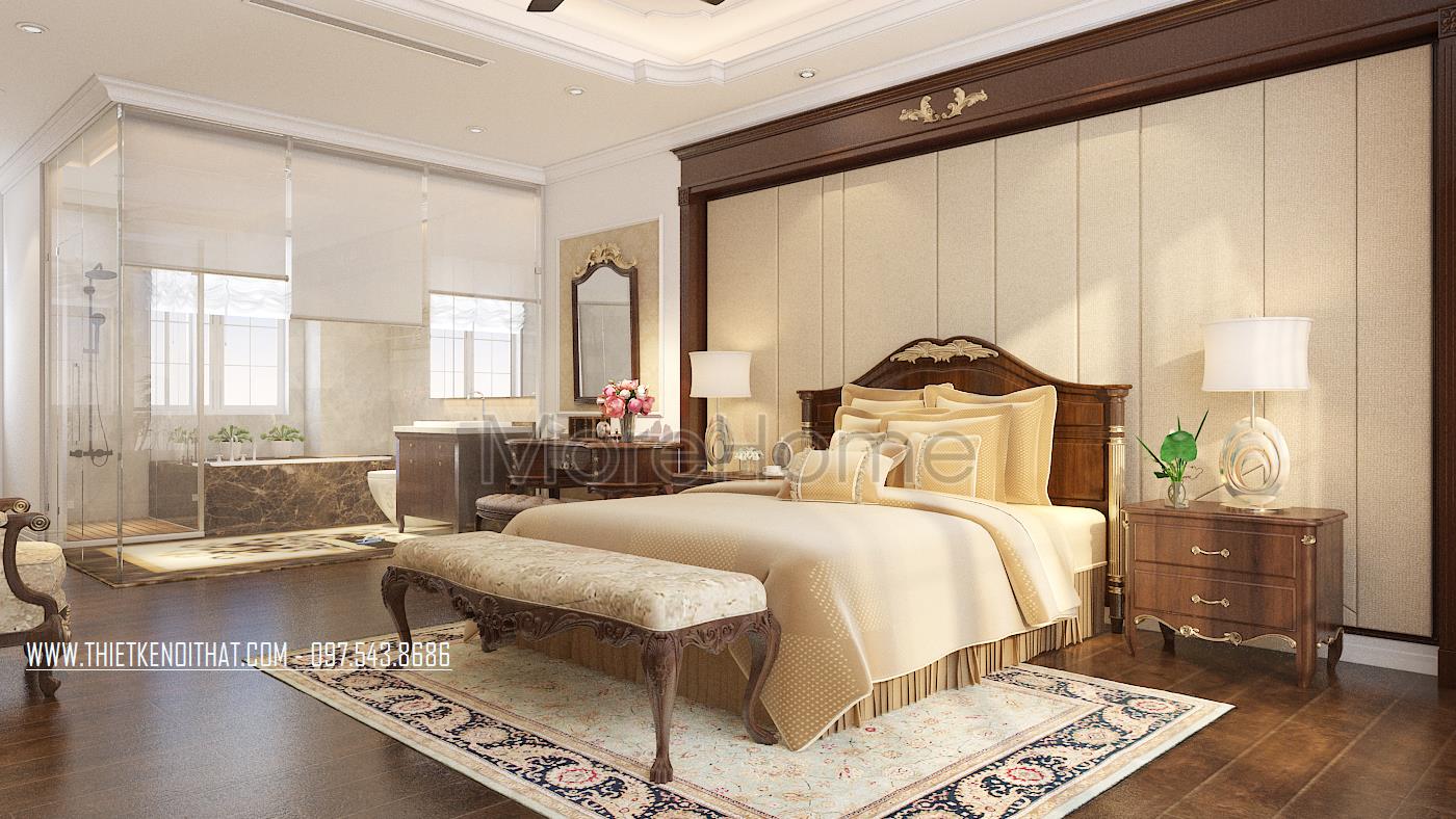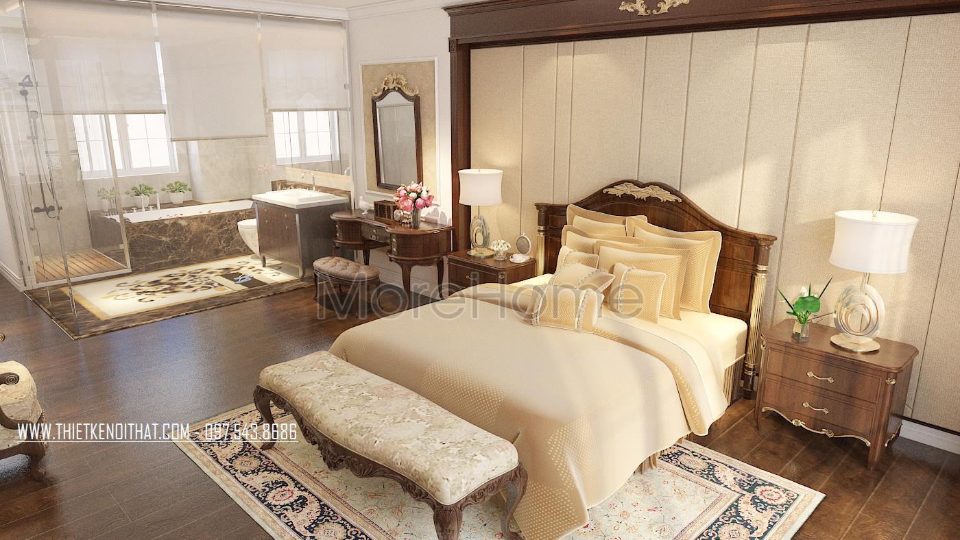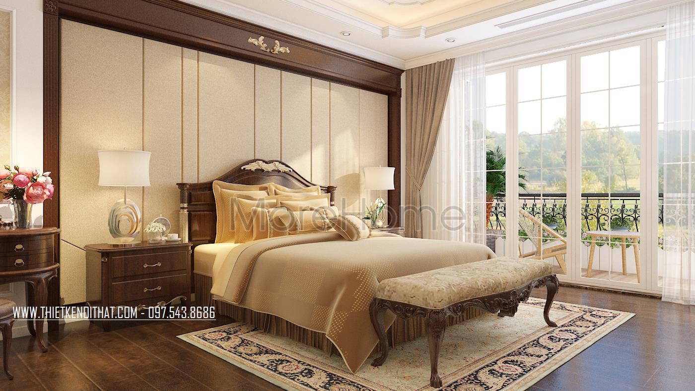 Tiếp theo là thiết kế nội thất phòng ngủ tân cổ điển. Vẻ đẹp sang trọng, quý phái được kiến trúc sư gửi gắm trong từng đường nét trạm khắc trên khung giường đến thiết kế trang trí đường nét trên tường. Thay vì thiết kế giản đơn với bốn bức tường sơn đơn sắc, kiến trúc sư đã khéo léo sử dụng giấy dán tường chất liệu đơn giản, hoa văn nhẹ nhàng và tone màu đồng nhất giúp mang đến cảm giác đồng bộ và cân bằng cho căn phòng.
