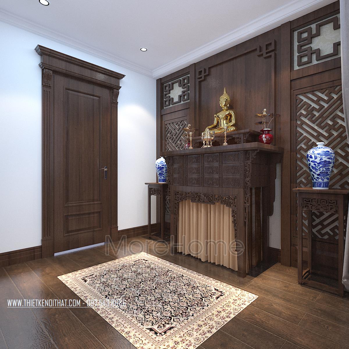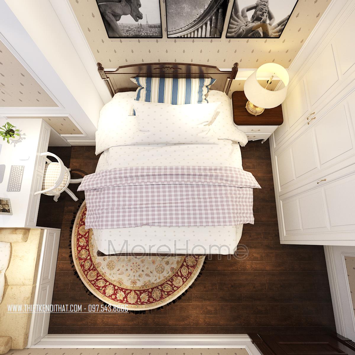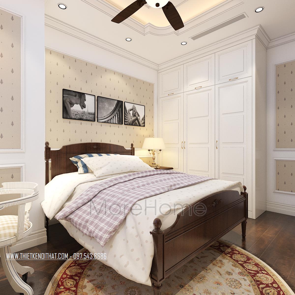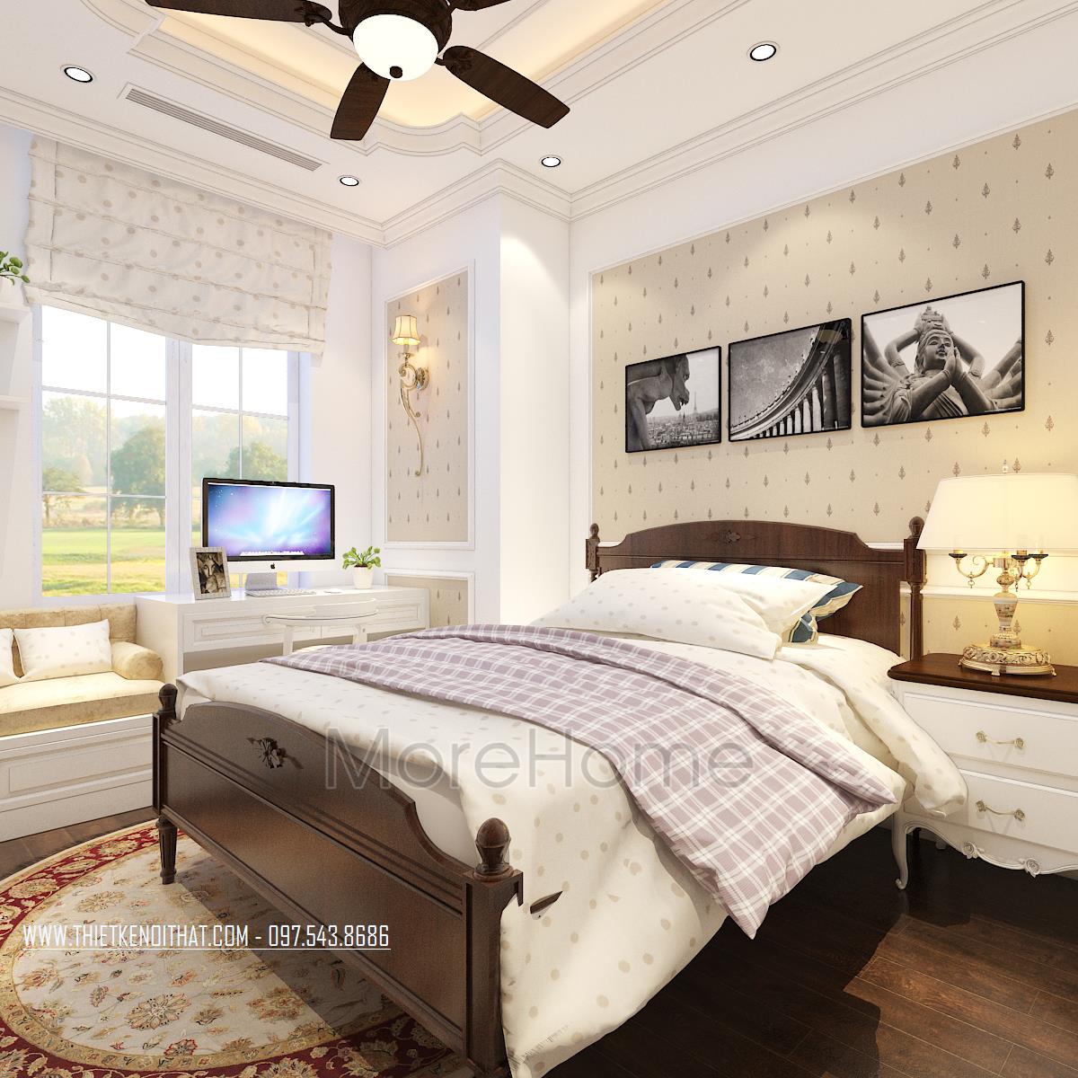 Tiếp theo là thiết kế nội thất phòng ngủ tân cổ điển. Vẻ đẹp sang trọng, quý phái được kiến trúc sư gửi gắm trong từng đường nét trạm khắc trên khung giường đến thiết kế trang trí đường nét trên tường. Thay vì thiết kế giản đơn với bốn bức tường sơn đơn sắc, kiến trúc sư đã khéo léo sử dụng giấy dán tường chất liệu đơn giản, hoa văn nhẹ nhàng và tone màu đồng nhất giúp mang đến cảm giác đồng bộ và cân bằng cho căn phòng.