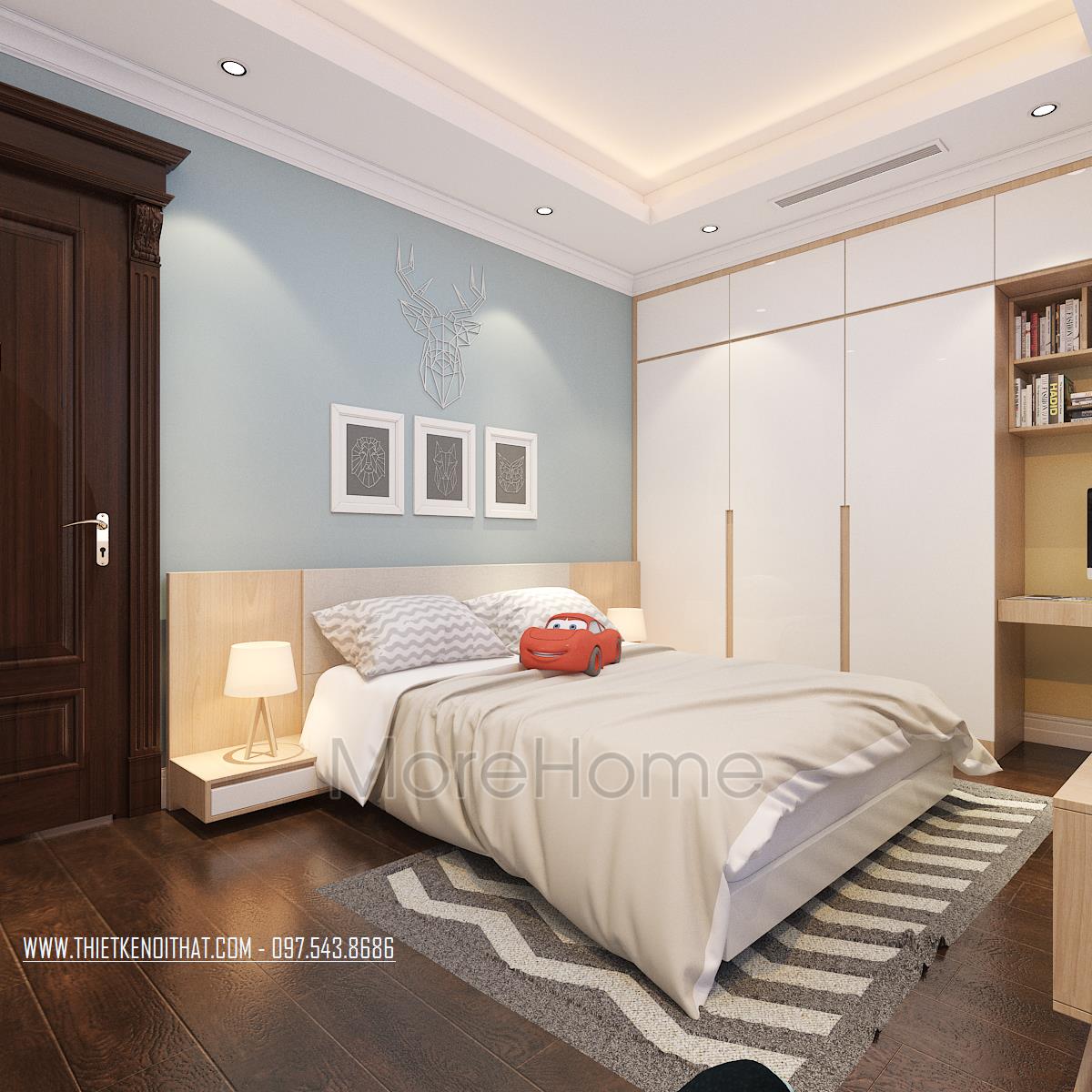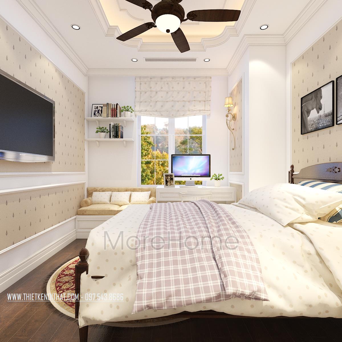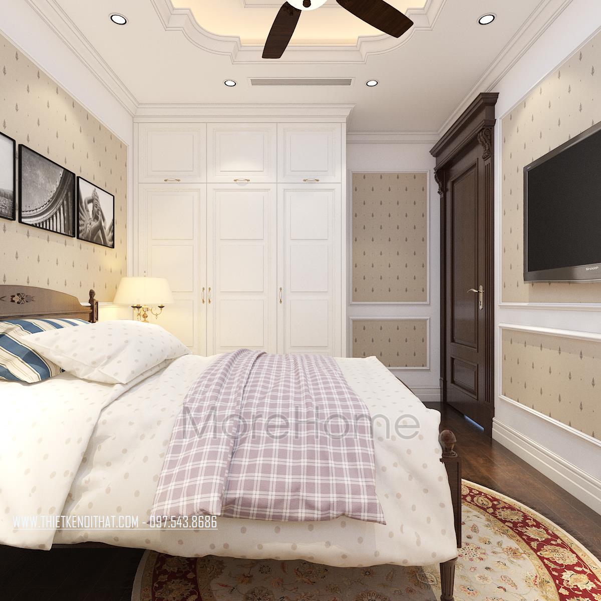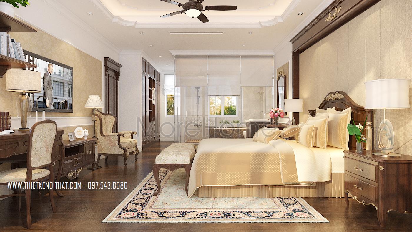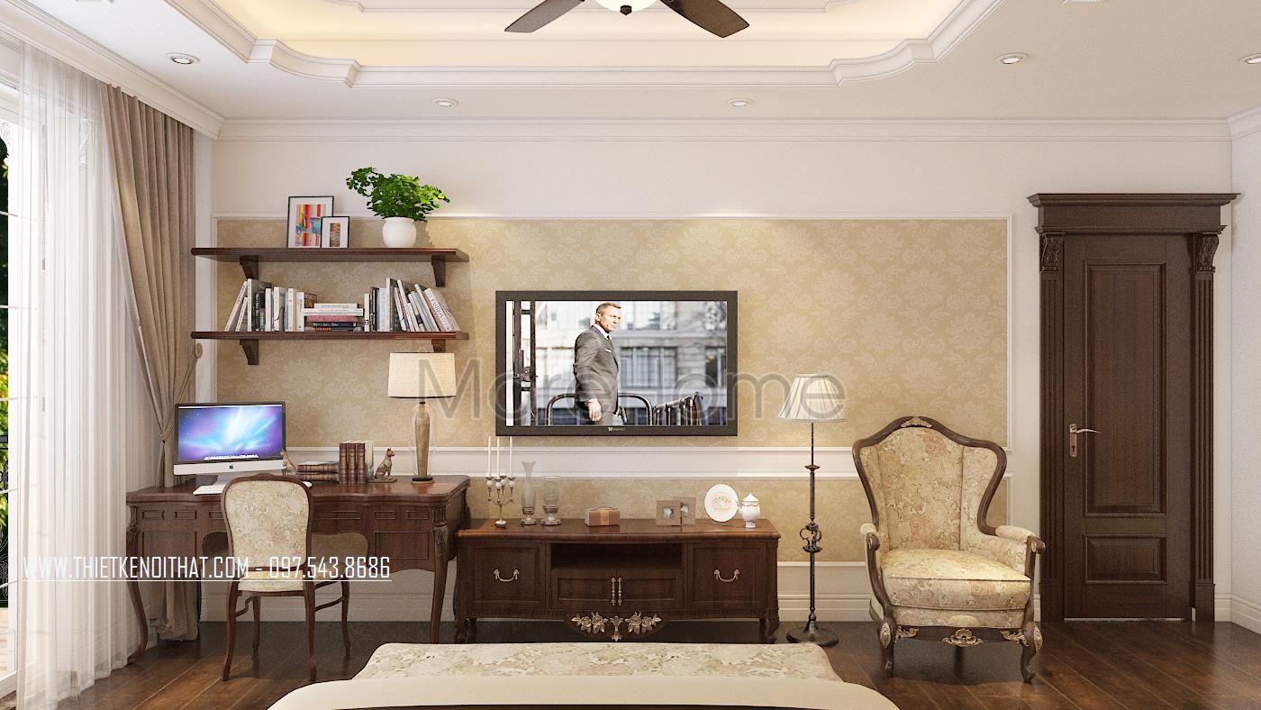 Thiết kế phòng ngủ không sử dụng quá nhiều tone màu tối, gây cảm giác bức bối mà thay vào đó, tone màu trắng được sử dụng nhiều hơn, vừa phù hợp với sở thích của gia chủ vừa đem lại cảm giác yên bình và dễ chịu. Tủ đồ được đặt khéo léo không cầu kỳ, tạo mặt phẳng tường đơn giản vừa tạo cảm giác cơi nới không gian mà không làm ảnh hưởng đến tính công năng của sản phẩm. Đặc biệt, thiết kế nội thất phòng ngủ Master mở ra một không gian hoàn toàn khác, gợi cảm giác sang trọng và quý phái. Các đường cong mềm mại và tinh tế là điểm nhấn của các thiết kế này, vừa phô được vẻ đẹp của tân cổ điển lại không làm ảnh hưởng đến diện tích không gian, không tạo cảm giác bí bách, bó hẹp cho căn phòng.