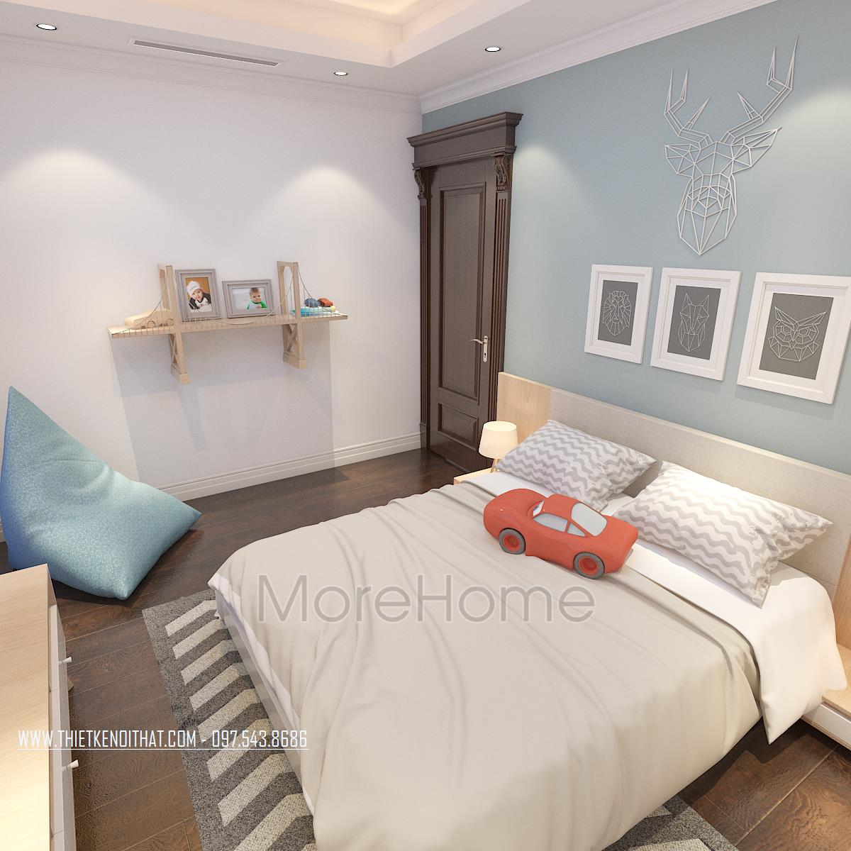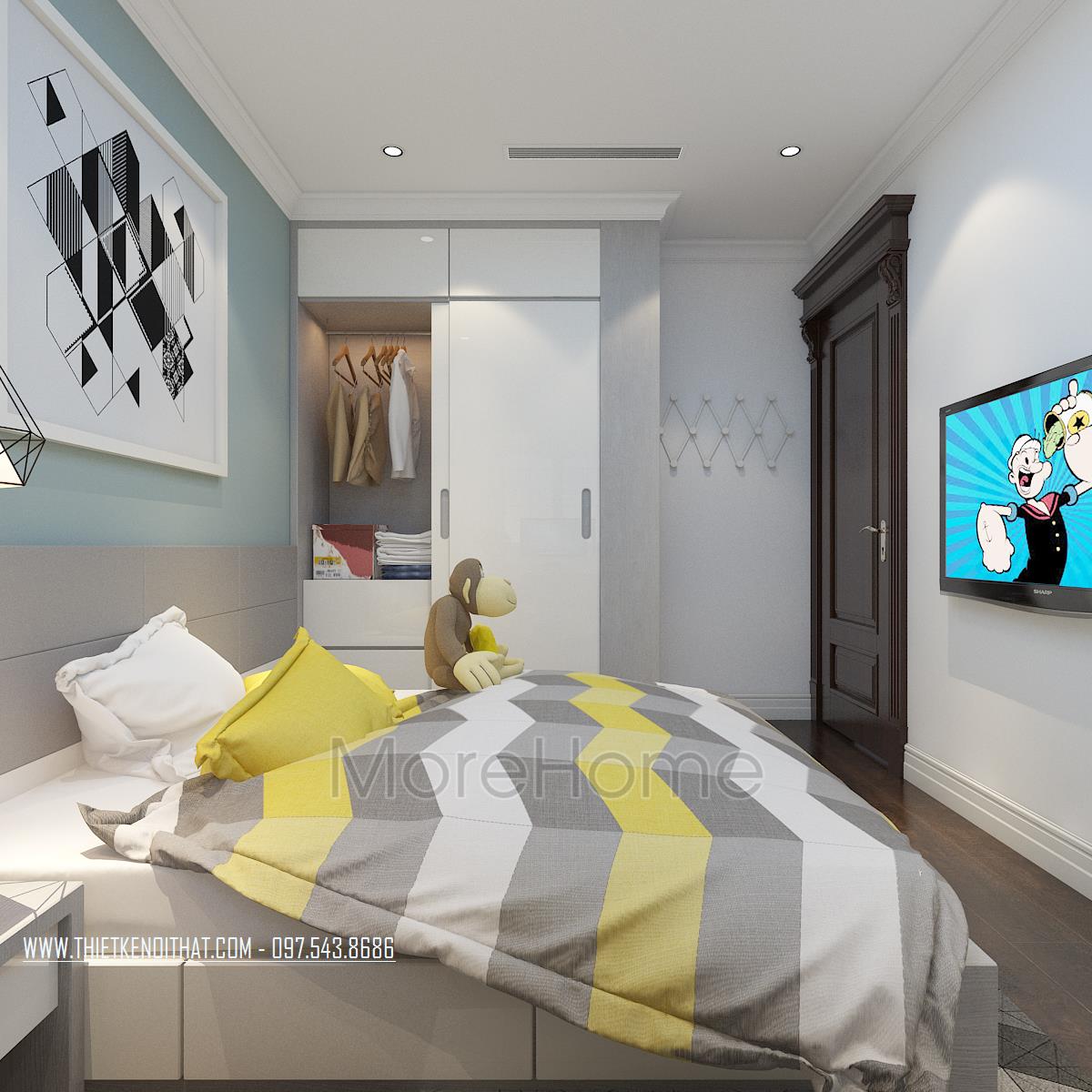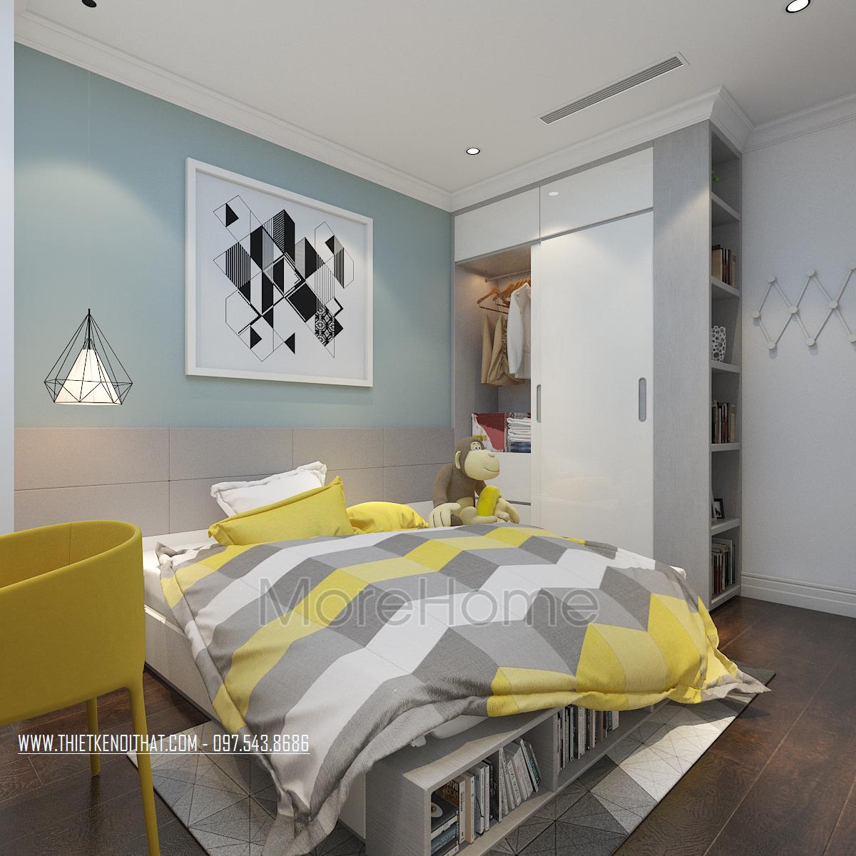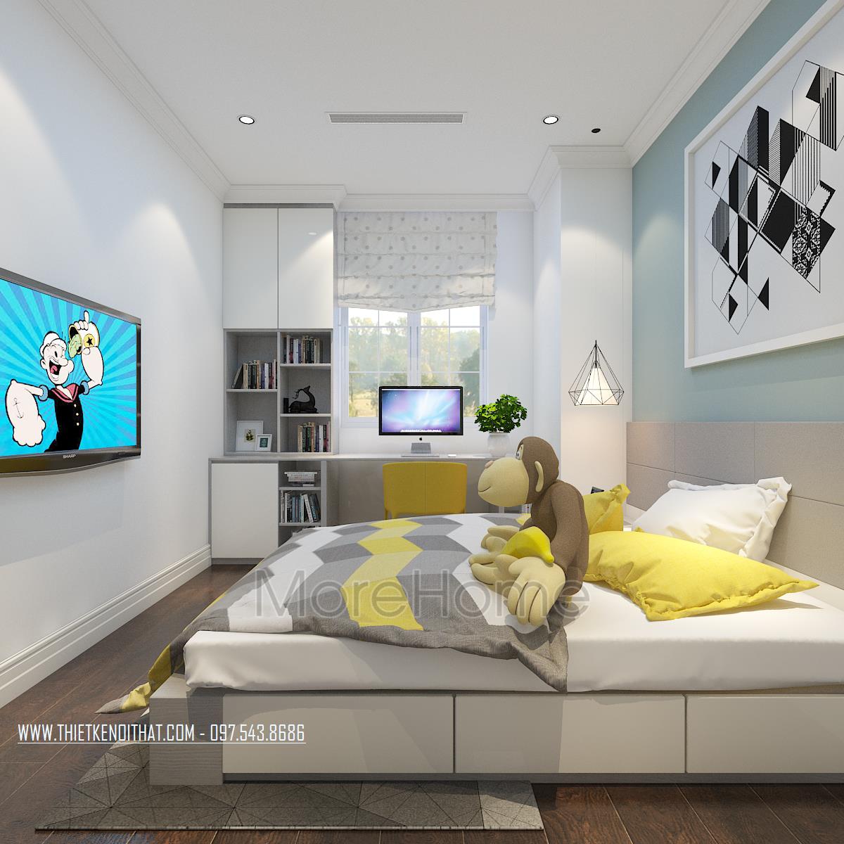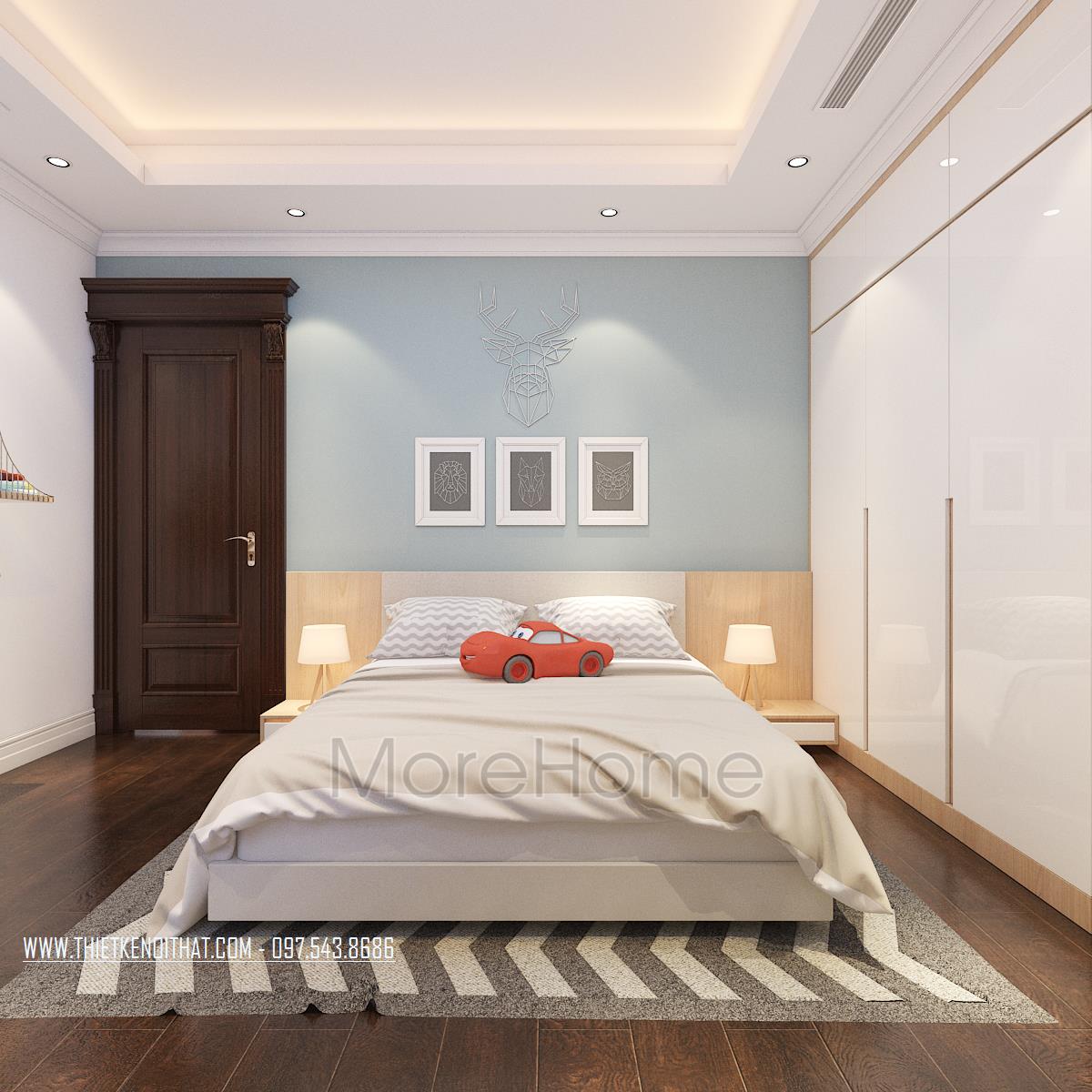 Thiết kế phòng ngủ không sử dụng quá nhiều tone màu tối, gây cảm giác bức bối mà thay vào đó, tone màu trắng được sử dụng nhiều hơn, vừa phù hợp với sở thích của gia chủ vừa đem lại cảm giác yên bình và dễ chịu. Tủ đồ được đặt khéo léo không cầu kỳ, tạo mặt phẳng tường đơn giản vừa tạo cảm giác cơi nới không gian mà không làm ảnh hưởng đến tính công năng của sản phẩm. Đặc biệt, thiết kế nội thất phòng ngủ Master mở ra một không gian hoàn toàn khác, gợi cảm giác sang trọng và quý phái. Các đường cong mềm mại và tinh tế là điểm nhấn của các thiết kế này, vừa phô được vẻ đẹp của tân cổ điển lại không làm ảnh hưởng đến diện tích không gian, không tạo cảm giác bí bách, bó hẹp cho căn phòng.