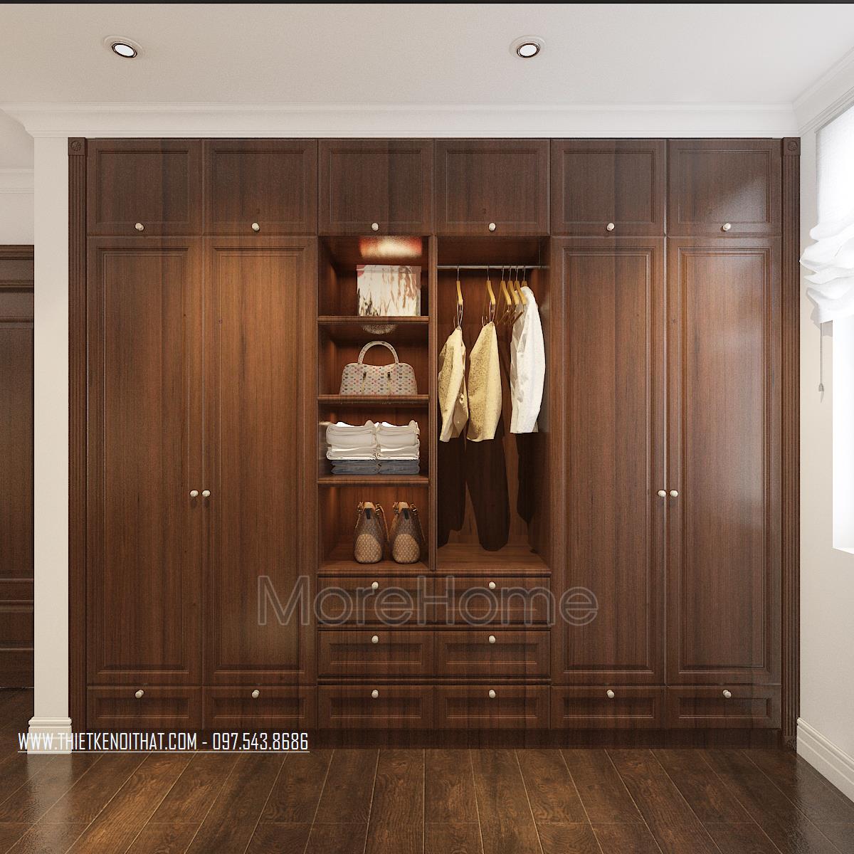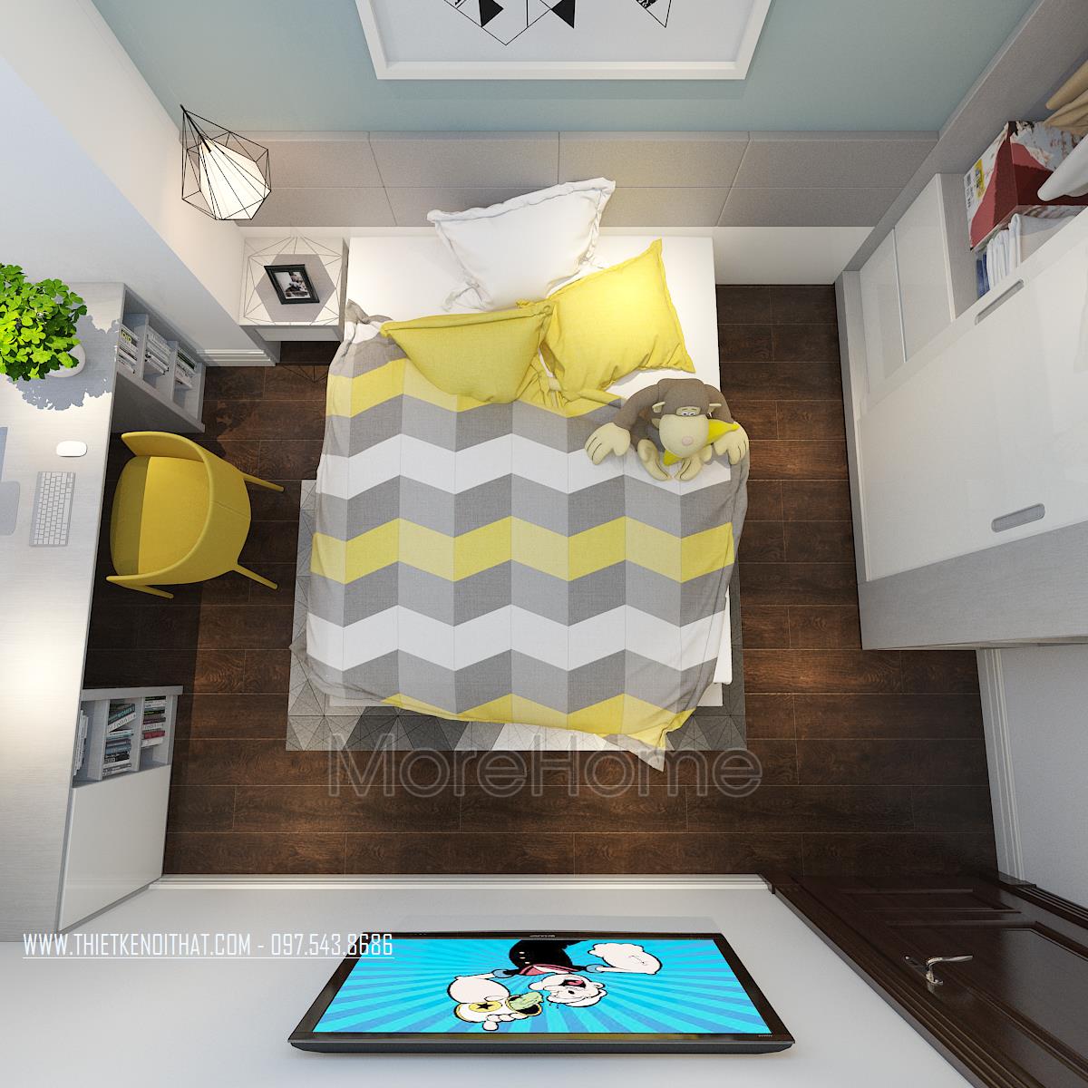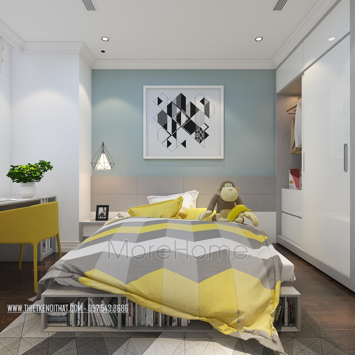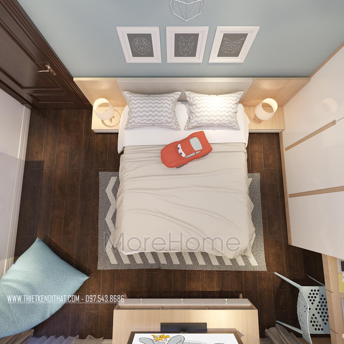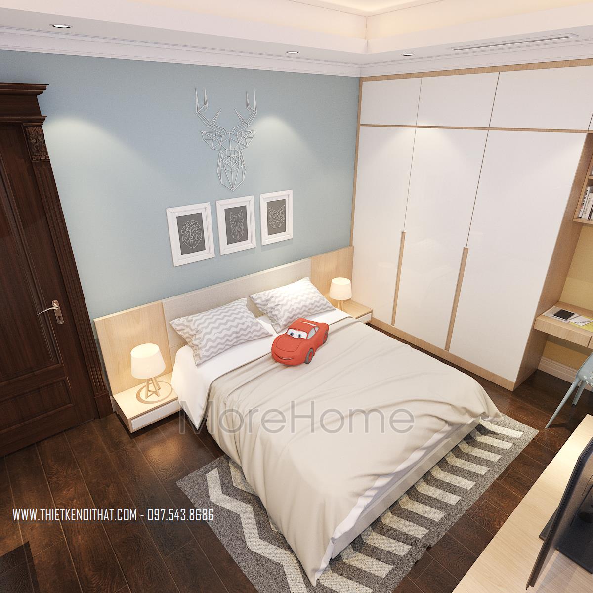 Thiết kế phòng ngủ không sử dụng quá nhiều tone màu tối, gây cảm giác bức bối mà thay vào đó, tone màu trắng được sử dụng nhiều hơn, vừa phù hợp với sở thích của gia chủ vừa đem lại cảm giác yên bình và dễ chịu. Tủ đồ được đặt khéo léo không cầu kỳ, tạo mặt phẳng tường đơn giản vừa tạo cảm giác cơi nới không gian mà không làm ảnh hưởng đến tính công năng của sản phẩm. Đặc biệt, thiết kế nội thất phòng ngủ Master mở ra một không gian hoàn toàn khác, gợi cảm giác sang trọng và quý phái. Các đường cong mềm mại và tinh tế là điểm nhấn của các thiết kế này, vừa phô được vẻ đẹp của tân cổ điển lại không làm ảnh hưởng đến diện tích không gian, không tạo cảm giác bí bách, bó hẹp cho căn phòng.
