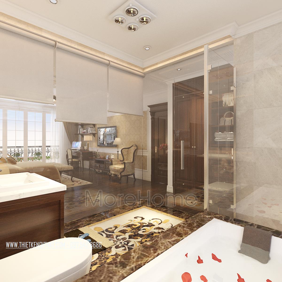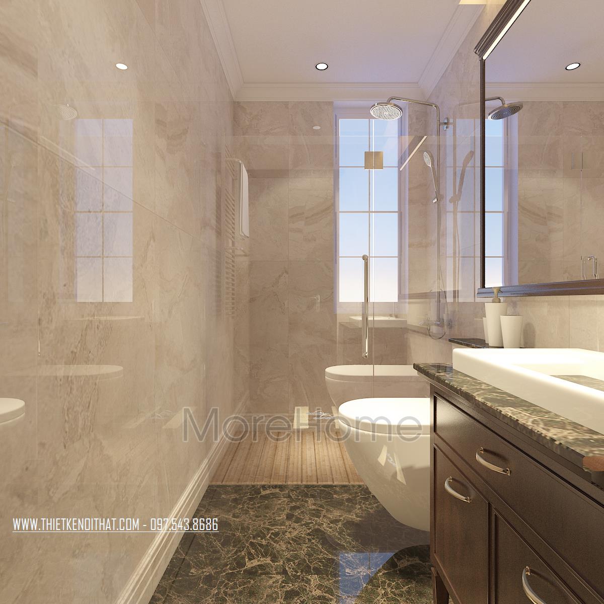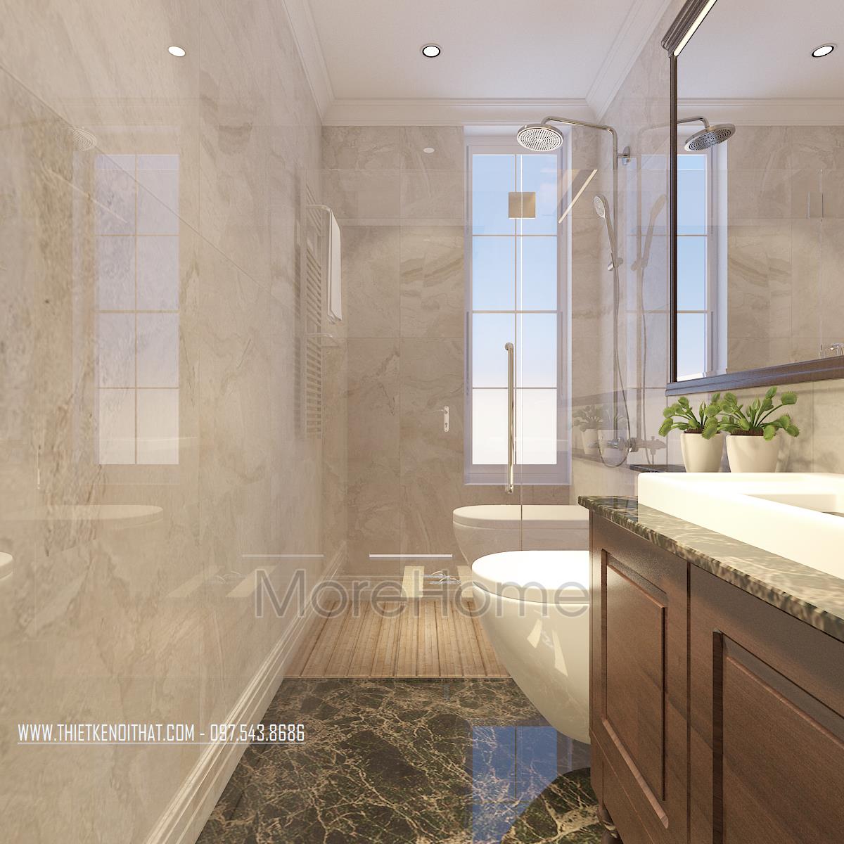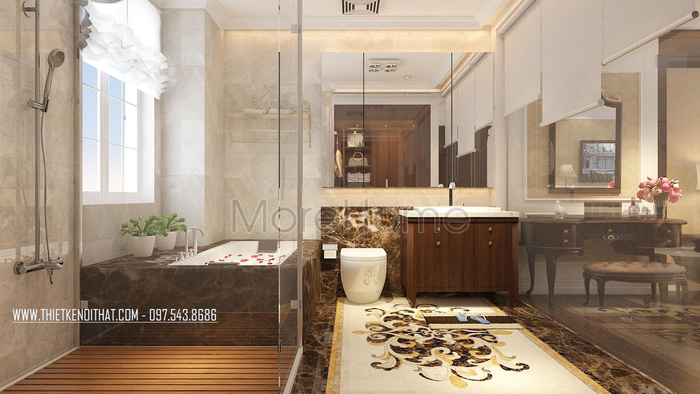 Cuối cùng là thiết kế nội thất phòng tắm cổ điển. Với thiết kế này, kiến trúc sư sử dụng hầu hết là các vật liệu nhẹ và có độ trong suốt, phản chiếu cao như kính, đá tự nhiên, gương. Nhờ vào các thiết kế sử dụng vật liệu này, kiến trúc sư có thể dễ dàng điều phối không gian, tận dụng được ánh sáng tự nhiên, vừa tạo cảm giác cơi nới cho không gian lại mang lại vẻ đẹp trẻ trung, sang trọng.