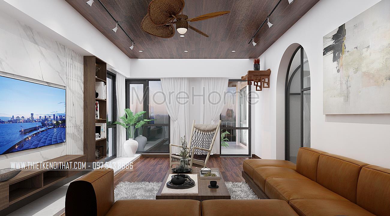 Thiết kế nội thất phòng khách mang phong cách hiện đại ấm áp. Tone màu nâu và vàng da bò ấm áp là màu sắc được ưu ái sử dụng trong thiết kế này. Bộ sofa được lựa chọn có diện tích to bản, tạo thế vững chắc, an toàn. Ngoài ra, thiết kế trần nhà đơn sắc hay sử dụng ánh sáng ấm trần đã trở nên quá phổ biến, vì vậy kiến trúc sư đã khéo léo thay đổi thành thiết kế gỗ ốp tone màu nâu veneer ấm áp, vừa đảm bảo màu sắc cân bằng, hài hòa, vừa tạo điểm nhấn cho không gian sinh hoạt chung.