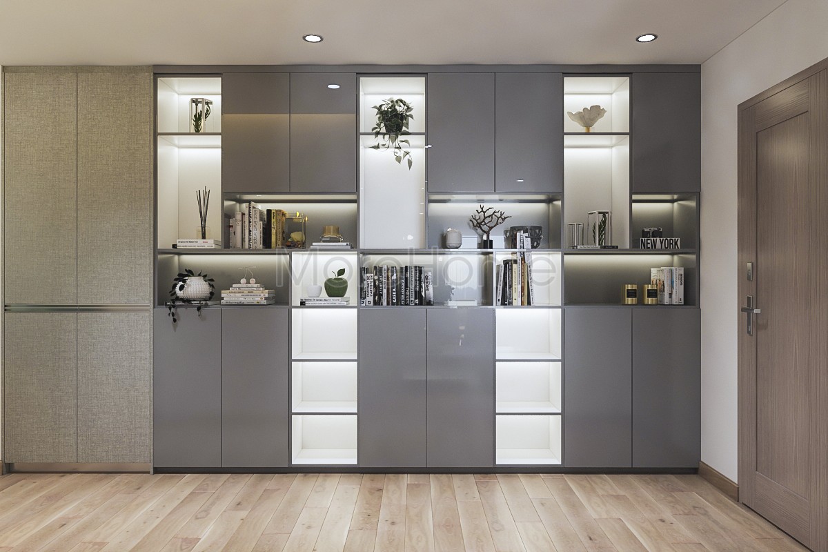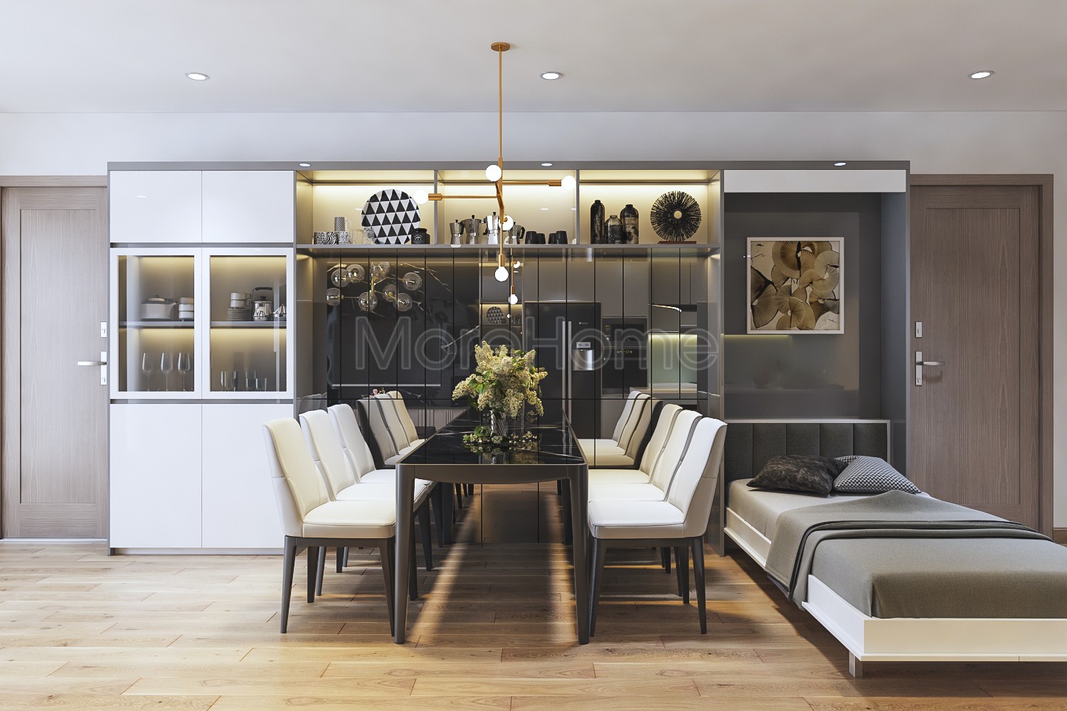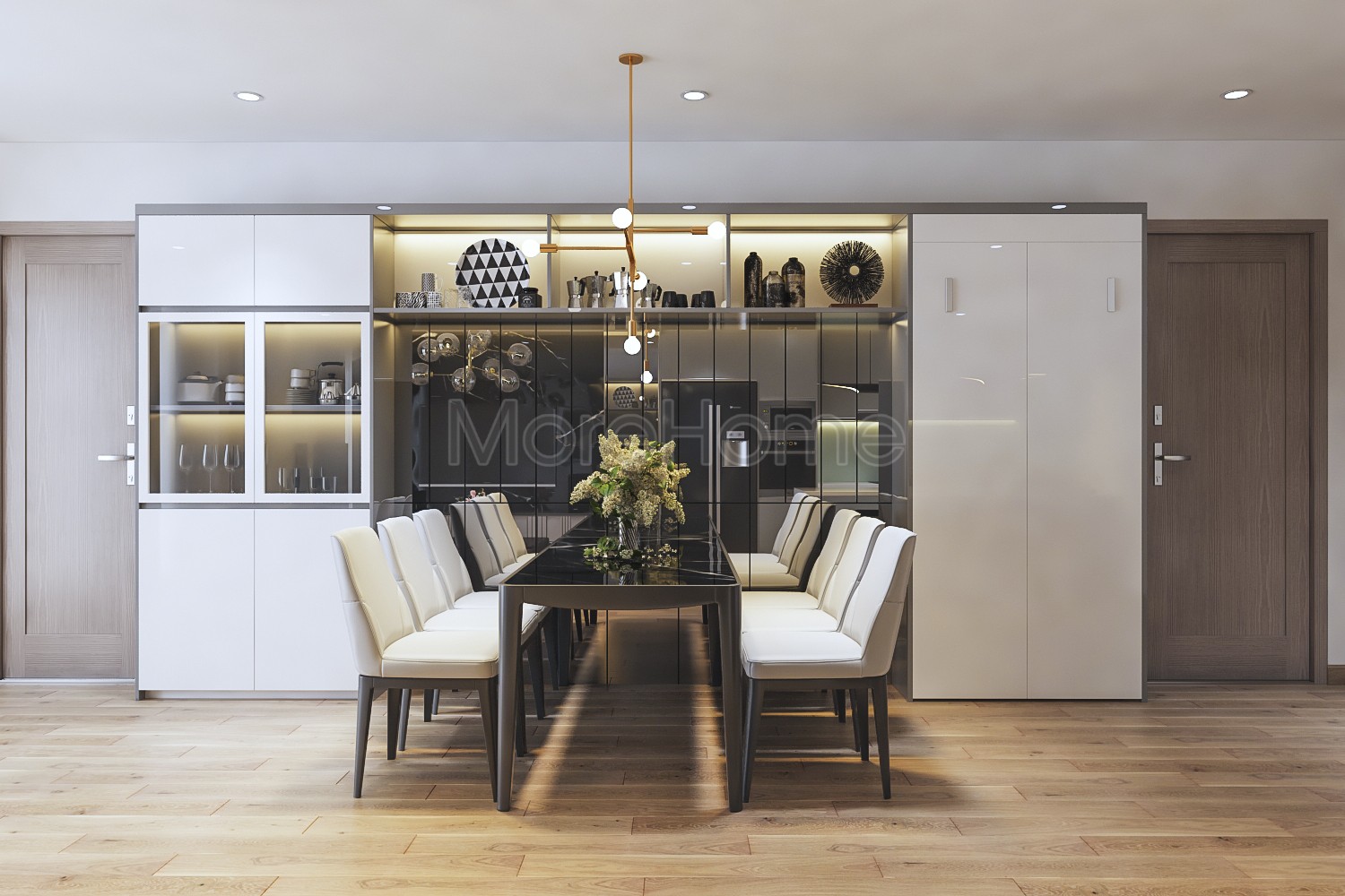 Tiếp theo là thiết kế nội thất khu vực bàn ăn. Điểm nổi bật của khu vực này chính là thiết kế tủ kệ kết hợp. Một bức tường lớn được dành cho thiết kế này, thiết kế tủ mở, đặt âm tường giúp gia chủ tiết kiệm một lượng hơn không gian mà không làm ảnh hưởng đến tính công năng của sản phẩm. Với đặc điểm sử dụng các vật liệu nhẹ như gỗ, kính cường lực nên thiết kế cũng không tạo cảm giác nặng nề, mà thay vào đó là sự giản đơn, hiện đại, và thoải mái. Tone màu mà kiến trúc sư lựa chọn cũng khá đồng nhất với các thiết kế nơi phòng khách, vì vậy nhanh chóng tạo sự đồng bộ và thống nhất.