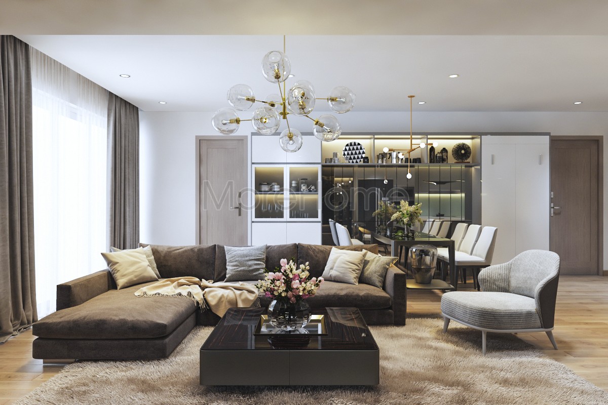 Thiết kế nội thất phòng khách phong cách hiện đại sử dụng màu trắng làm màu nền, sắc nâu trầm ấm được kiến trúc sư sử dụng làm màu chủ đạo cho các thiết kế vật dụng như ghế tựa, rèm cửa, bàn nước,… Tone màu nâu ấm áp luôn là lựa chọn hoàn hảo cho các thiết kế không gian sinh hoạt chung, với thiết kế này, không gian trở nên gần gũi và an toàn hơn. Bộ sofa được kiến trúc sư lựa chọn có kích cỡ khá lớn, thiết kế linh hoạt, phù hợp với các hoạt động của gia đình và an toàn cho trẻ nhỏ. Thiết kế nội thất đóng với bốn bức tường thu hẹp được thay thế bằng mảng tường khác biệt như tường kính cường lực trong suốt, nhờ đó mà tận dụng được lợi thế view rộng và ánh sáng tự nhiên.