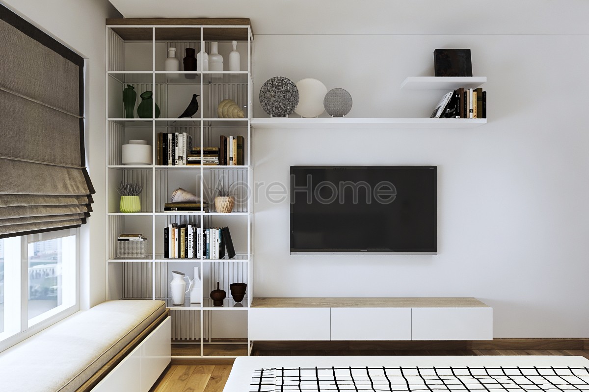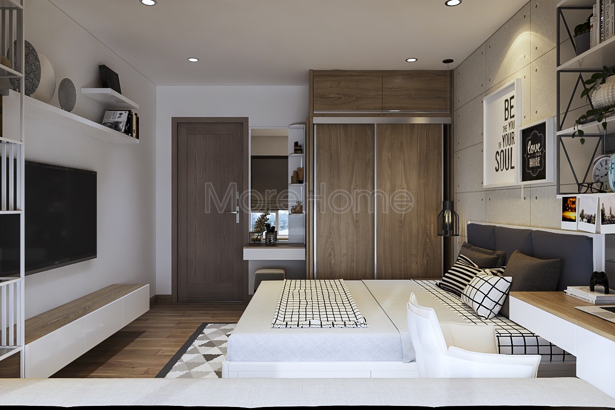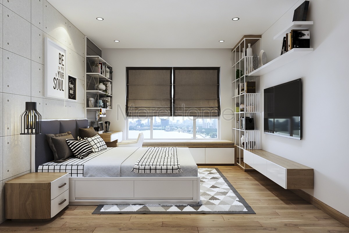 Tiếp theo là thiết kế nội thất không gian phòng ngủ hiện đại. Không gian phòng không quá rộng nhưng có thiết kế khá gọn gàng và tiện nghi. Một điểm nhấn hấp dẫn của căn phòng này chính là thiết kế mảng tường khác biệt. Thay vì sử dụng sơn đơn sắc, kiến trúc sư sử dụng các vật liệu nhẹ khác như giấy dán tường, đá ốp tường,… làm nổi bật căn phòng. Thiết kế tủ kệ kết hợp hầu hết sử dụng gỗ ép làm vật liệu chính, có độ bền cao và dễ dàng thay thế nếu cần.