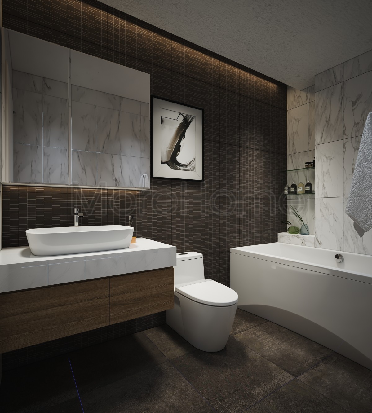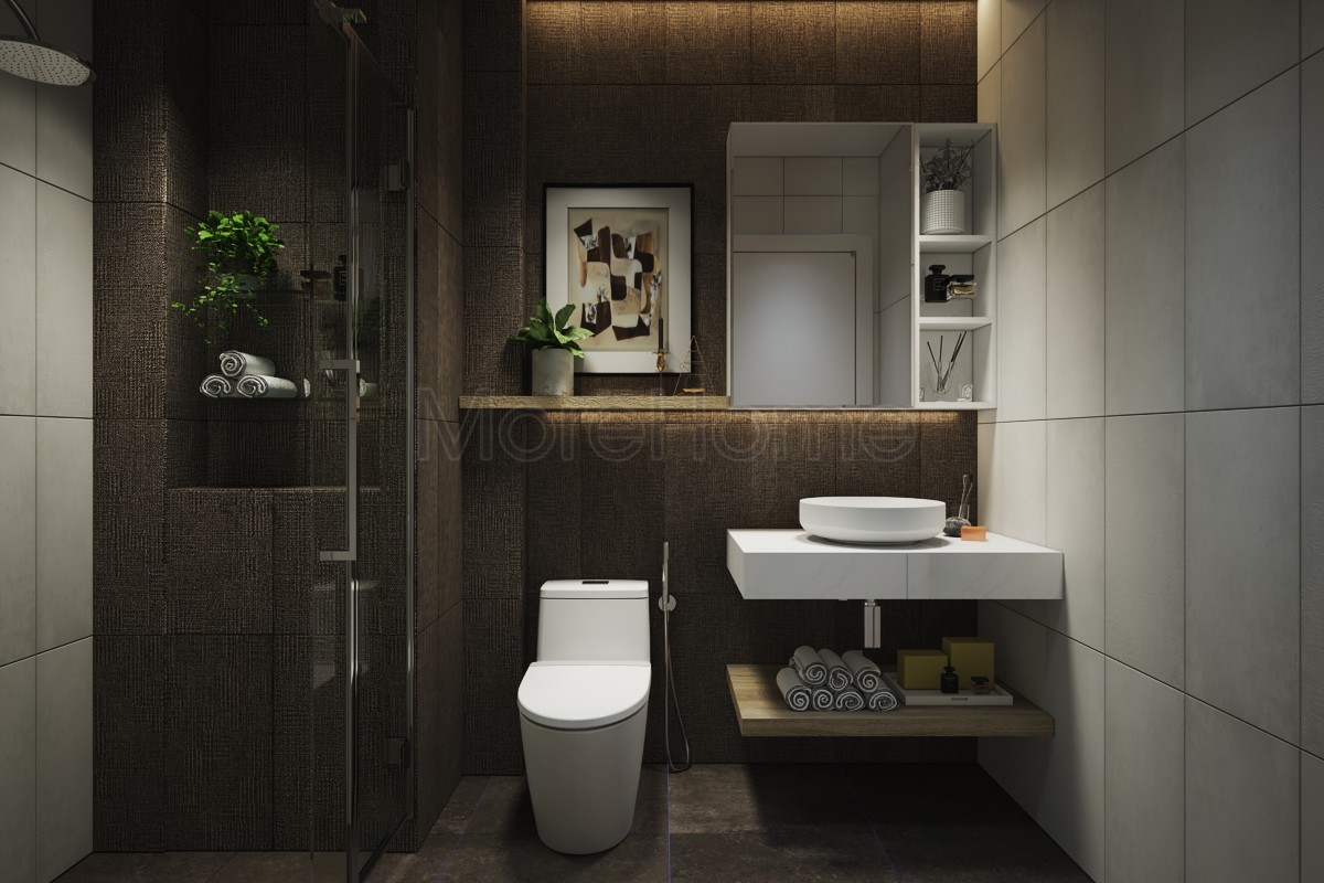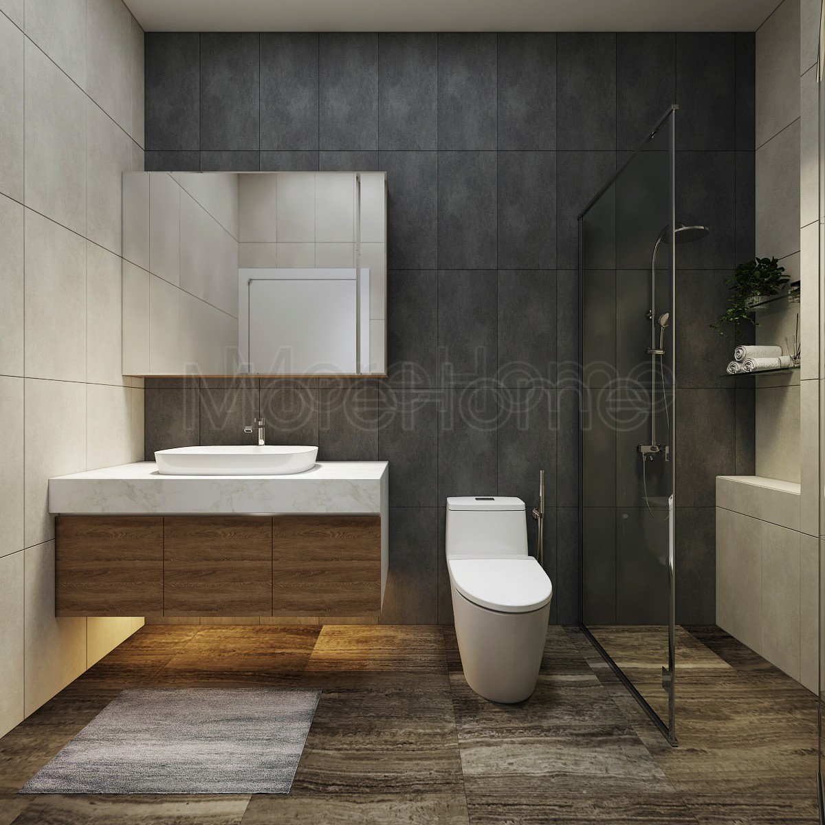 Cuối cùng là thiết kế nội thất phòng tắm hiện đại. Căn phòng sử dụng một màu ghi xám tối, gợi mở một không gian riêng tư an nhiên và dễ chịu. Các thiết kế sử dụng hiện đại và tiện nghi. Việc sử dụng gương, kính cường lực, hay đá tự nhiên đều giúp ánh sáng được phản chiếu nhẹ nhàng, mang lại cảm giác cơi nới và tăng độ mở cho căn phòng.