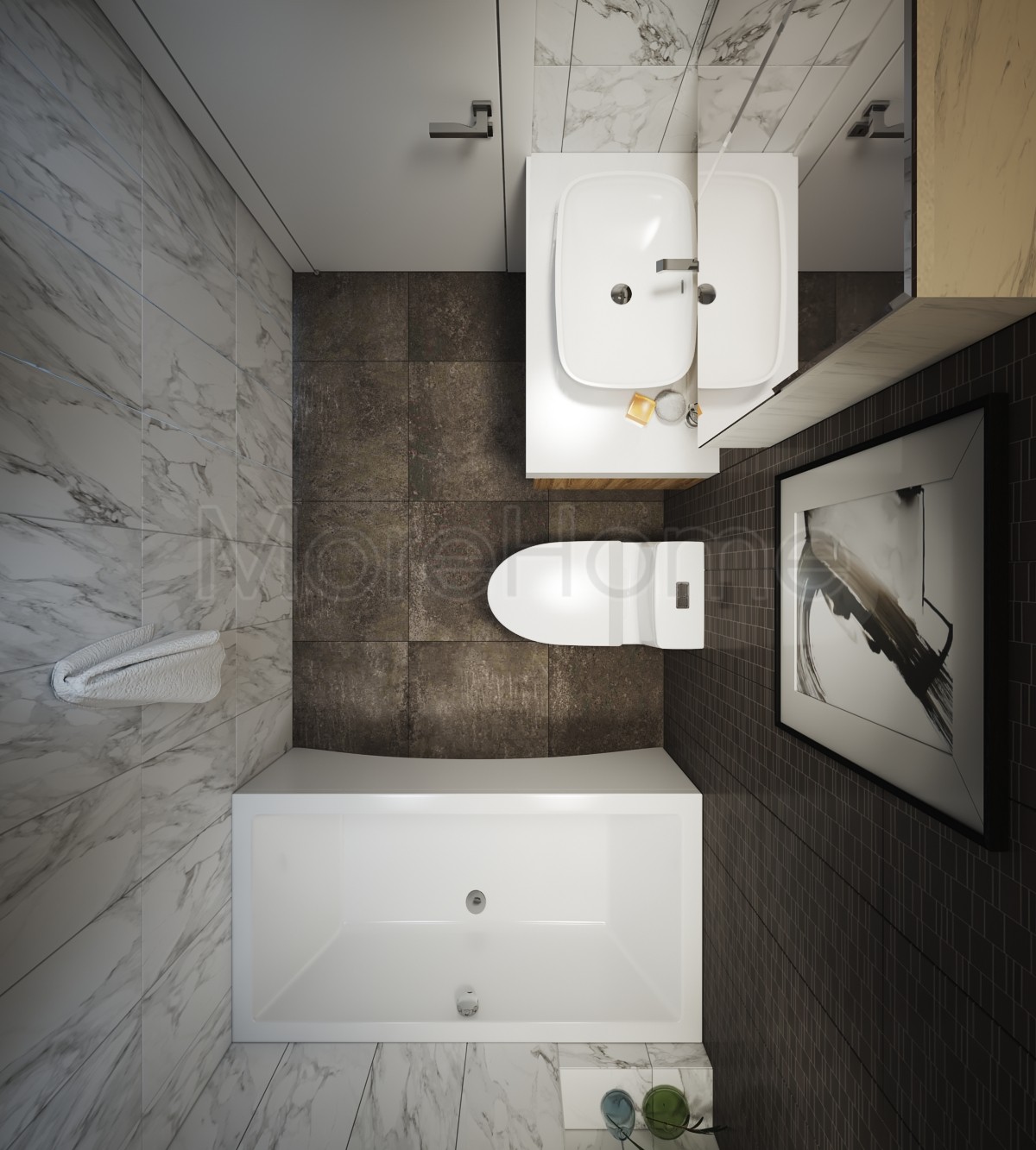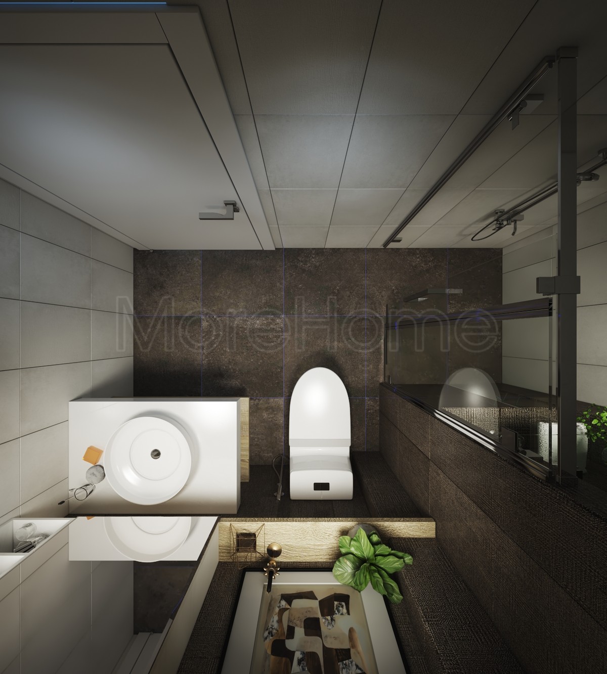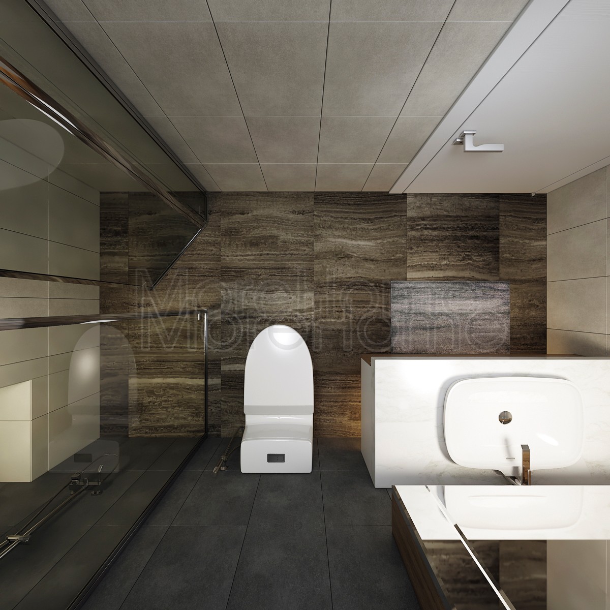 Cuối cùng là thiết kế nội thất phòng tắm hiện đại. Căn phòng sử dụng một màu ghi xám tối, gợi mở một không gian riêng tư an nhiên và dễ chịu. Các thiết kế sử dụng hiện đại và tiện nghi. Việc sử dụng gương, kính cường lực, hay đá tự nhiên đều giúp ánh sáng được phản chiếu nhẹ nhàng, mang lại cảm giác cơi nới và tăng độ mở cho căn phòng.