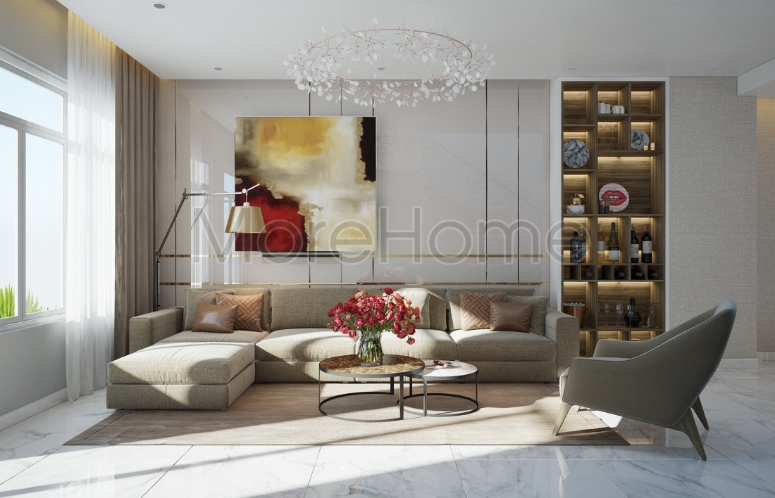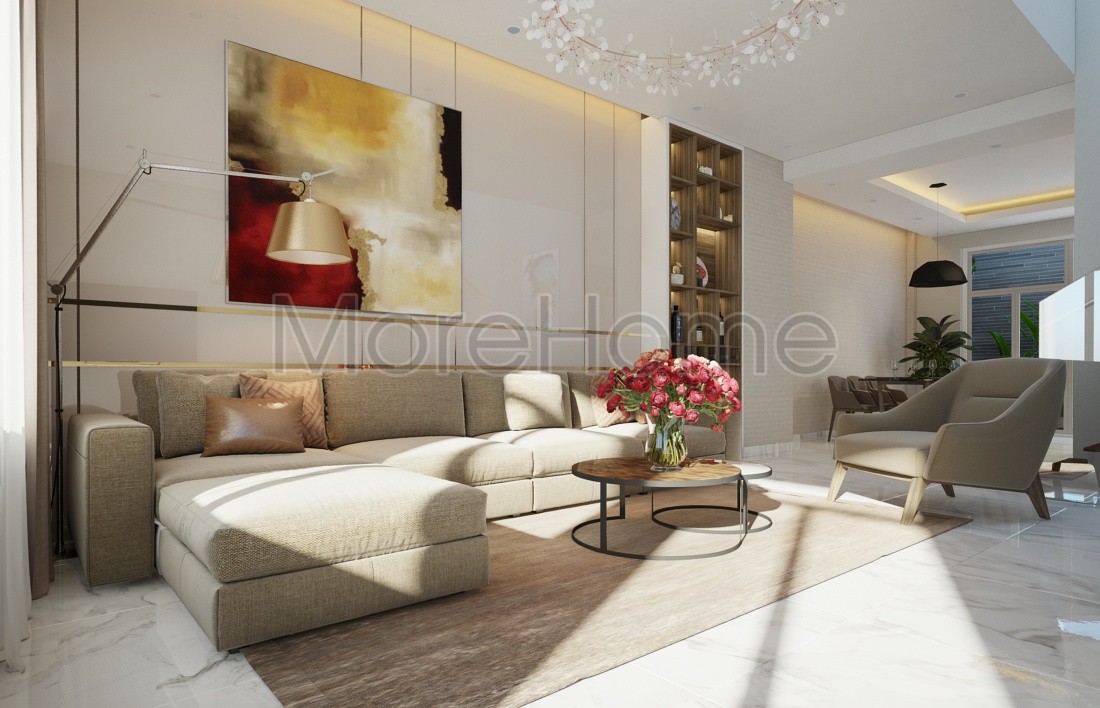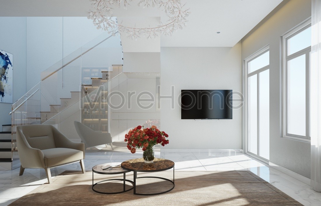 Thiết kế nội thất phòng khách hiện đại là một sự kết hợp khéo léo và nhẹ nhàng giữa đường nét và màu sắc. Các khối hình mà kiến trúc sư sử dụng là các khối hộp đơn giản, không thiên nhiều về các chi tiết trạm khắc hay đường cong mềm mại, chính vì vậy mà thiết kế trở nên khá rõ ràng và hiện đại. Bộ sofa đơn giản, có thiết kế dáng dài phù hợp với không gian căn nhà mà vẫn đảm bảo tính công năng của sản phẩm. Các vật liệu nhẹ được ưu ái sử dụng trong không gian này là kính cường lực trong suốt, gỗ tự nhiên, từ đó gợi cảm giác thông suốt, linh hoạt, và còn tạo cảm giác cơi nới cho không gian phòng.
