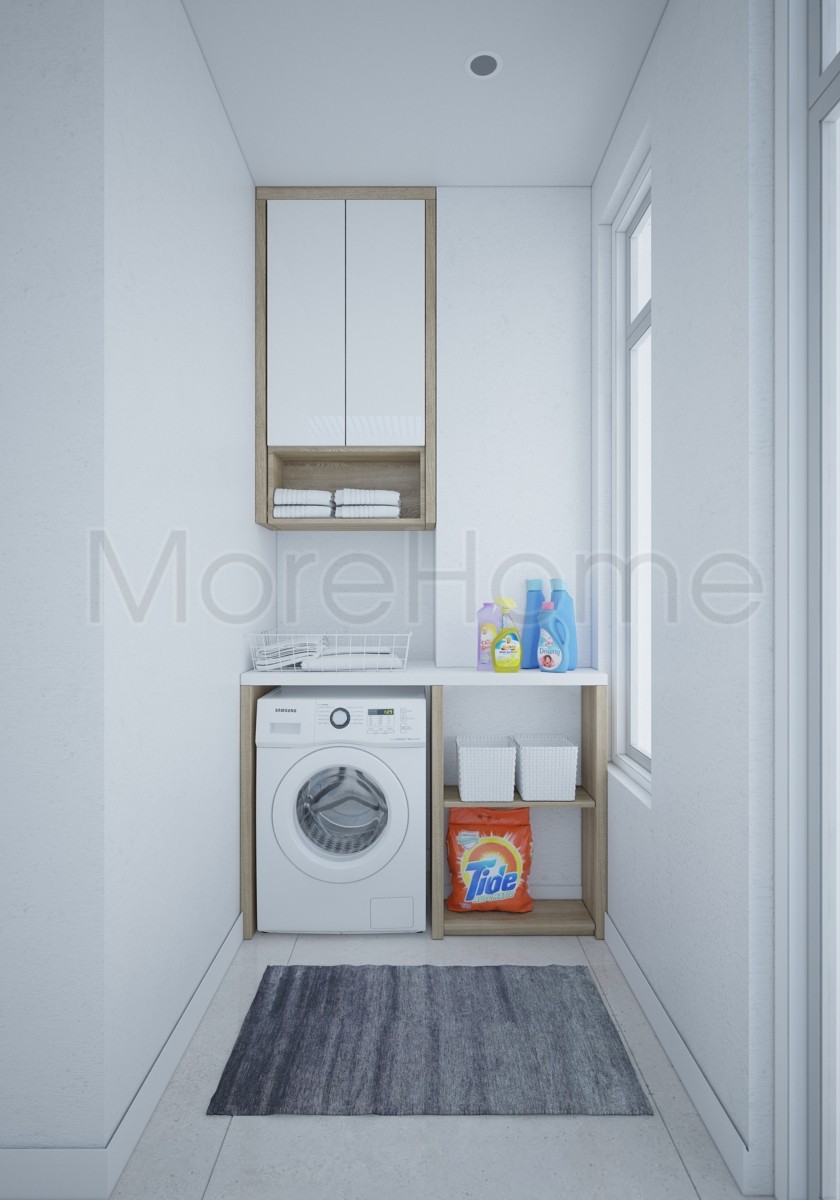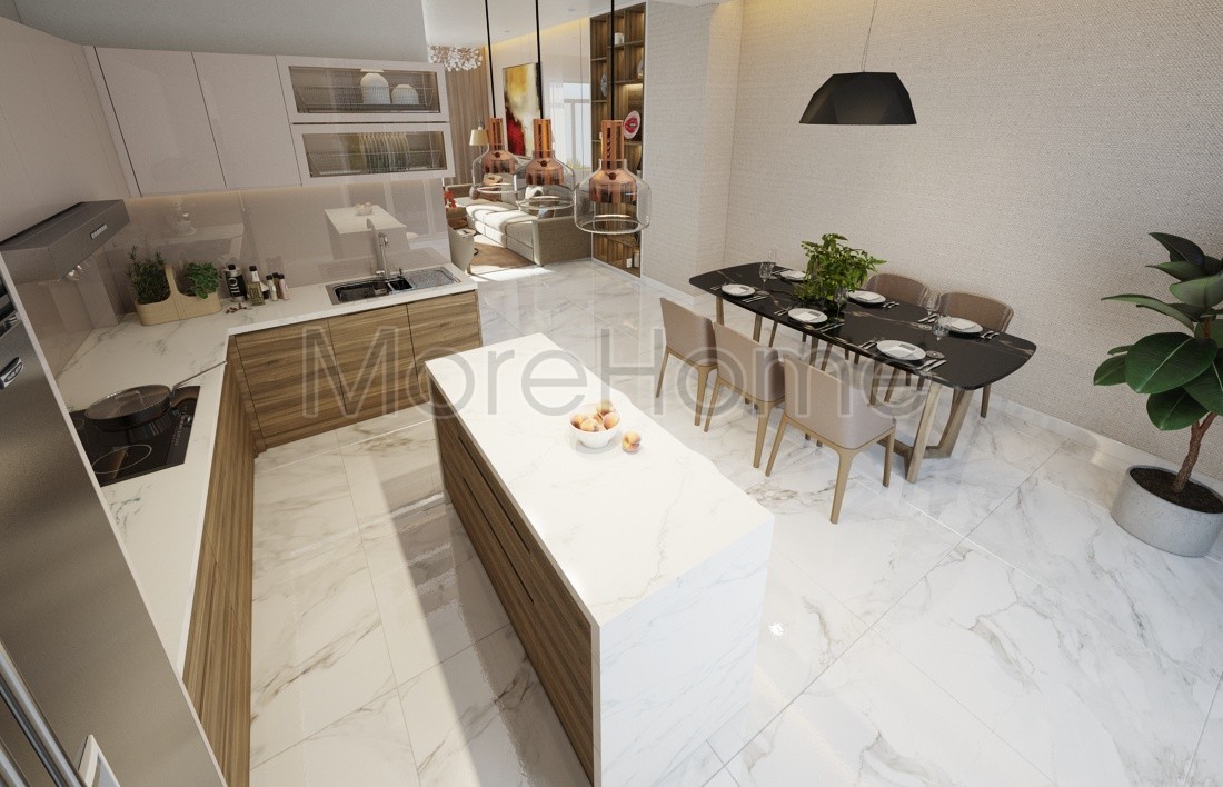Thiết kế nội thất căn bếp không quá chi tiết, điểm nhấn mà kiến trúc sư muốn nhấn mạnh là tính công năng. Thiết kế kệ tủ đơn giản, không có nhiều trang trí cầu kỳ, tuy nhiên để tránh cảm giác nhàm chán và đơn điệu cho không gian sống, kiến trúc sư đã khéo léo sử dụng thiết kế có vân gỗ nhẹ nhàng, tự nhiên, vừa đảm bảo tính thẩm mỹ vừa không làm ảnh hưởng đến không gian sử dụng.