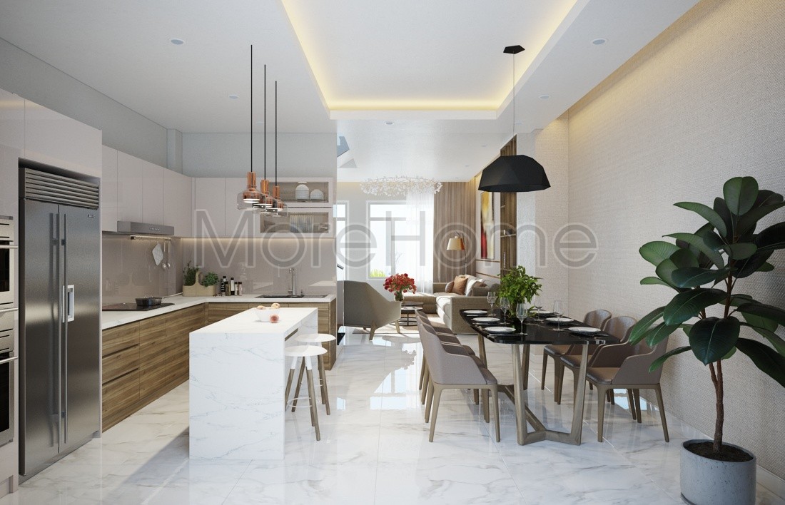 Không gian nội thất bếp và bàn ăn liền kề mang đến một không gian sống tiện nghi và thống nhất. Từ ánh sáng, màu sắc sử dụng đều được kiến trúc sư cân nhắc tỉ mỉ nhằm mang đến thiết kế ấn tượng nhất cho gia chủ. Bàn ăn thiết kế dáng chữ nhật, màu gỗ nâu trầm ấm áp. Thiết kế bàn rộng, linh hoạt, phù hợp với nhiều mục đích sử dụng của gia chủ. Không gian nội thất xanh cũng được gia chủ ưu ái. Nhờ vào việc đặt kính cường lực nhìn thông ra phía khu cây xanh nhỏ bên ngoài, hay việc đặt chậu cây ngay ở góc phòng khiến không gian trở nên thân thiện và dịu mát hơn.