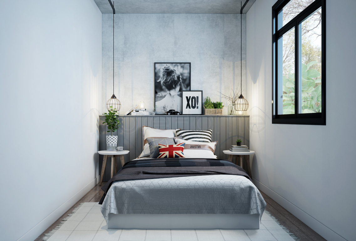 Tiếp theo là thiết kế nội thất phòng ngủ hiện đại đơn giản với thiết kế giường ngủ đơn gọn gàng, không gian phòng ngủ nhỏ tuy nhiên không ảnh hưởng nhiều đến tính công năng và sự tiện dụng của căn hộ. Thiết kể cửa sổ rộng đem ánh sáng tự nhiên vào căn phòng, đem ánh sáng tự nhiên và hứng khởi cho gia chủ và các thành viên trong gia đình. Nội thất thiết kế tủ gỗ được co gọn gàng thành các thiết kế đứng đơn giản đa ngăn vừa đảm bảo mang đến sự tiện lợi cho gia chủ lại không làm ảnh hưởng đến tính thẩm mỹ của không gian sống.