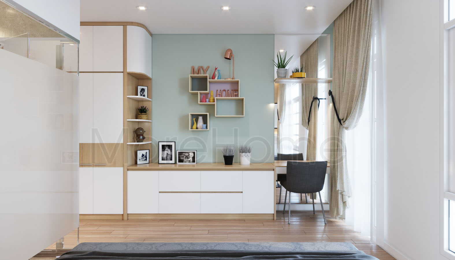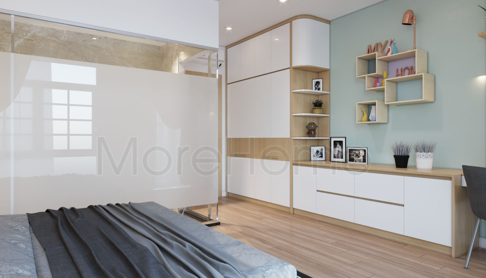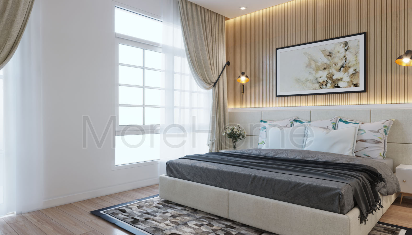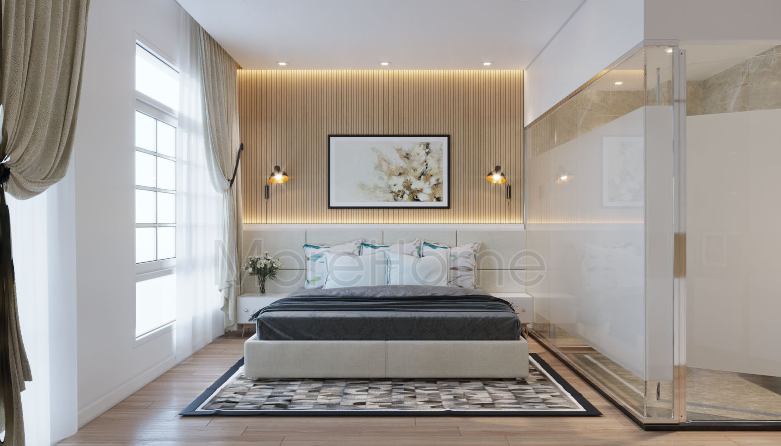 Đối với mỗi người, phòng ngủ là không gian riêng tư mang đến sự an toàn và dễ chịu. Chính vì vậy mà thiết kế nội thất phòng ngủ ở căn nhà phố này cũng khéo léo tạo các không gian mở, tone màu ấm, pastel nhẹ nhàng để từ đó gợi một không gian an nhiên theo ý của gia chủ. Ánh sang tự nhiên được lấy từ các khung cửa rộng, kính cường lực trong suốt được sử dụng để tăng tối đa hiệu quả chiếu sáng. Ngoài ra, các thiết kế tường đơn sắc được thay thế bằng thiết kế giấy dán tường vân gỗ dọc nhẹ nhàng tạo điểm nhấn và tránh sự nhàm chán cho không gian.