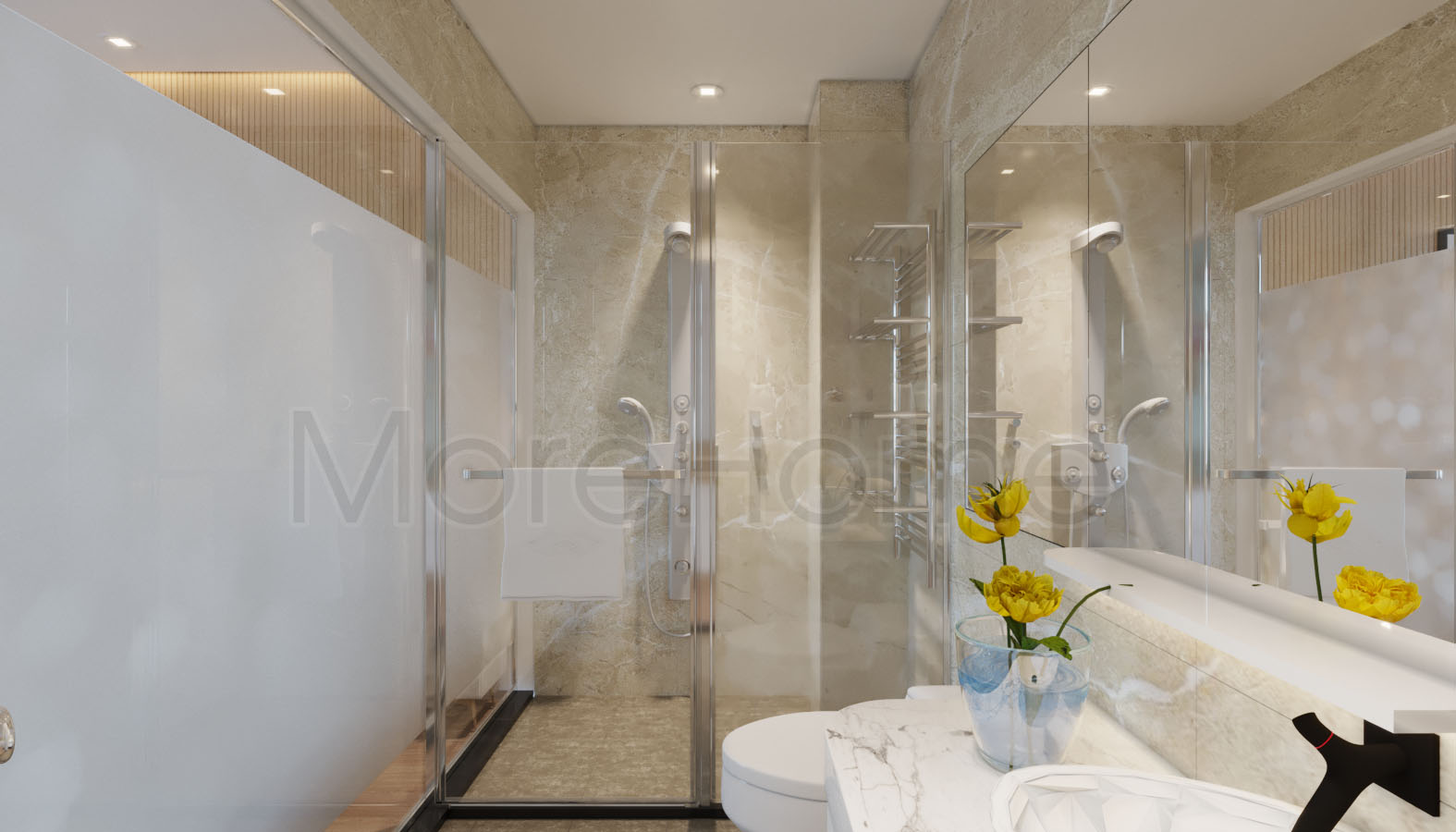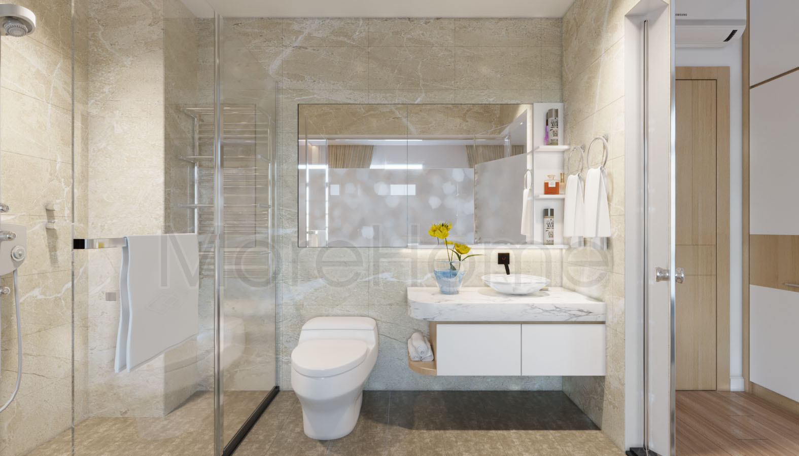 Cuối cùng là thiết kế nội thất phòng tắm hiện đại. Các vật liệu nhẹ như kính cường lực trong suốt, gạch ốp vân hoa đơn giản, hay gương chiếu sáng, đá tự nhiên đều được tận dụng để tạo độ phản chiếu nhẹ nhàng từ đó góp phần mở rộng và tăng độ thoáng cho không gian.