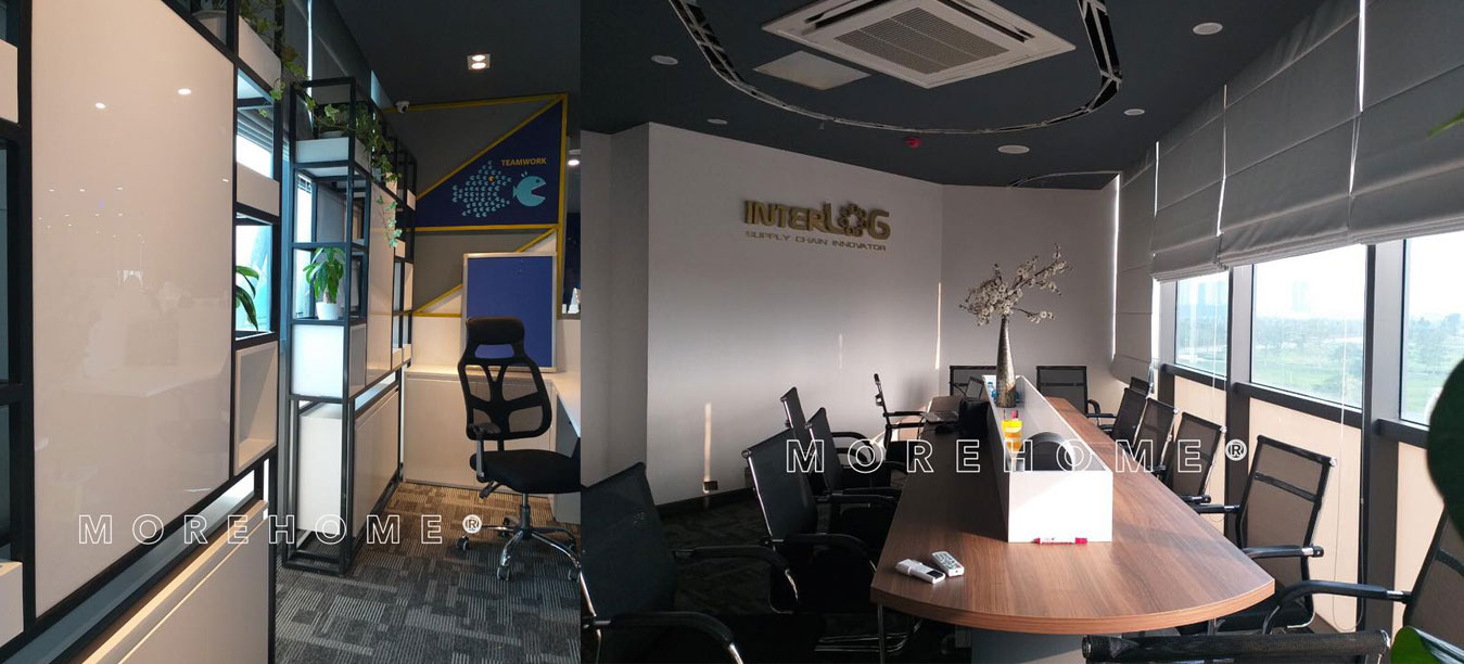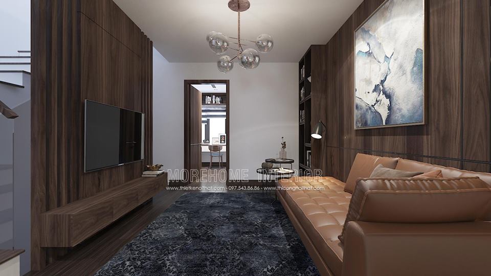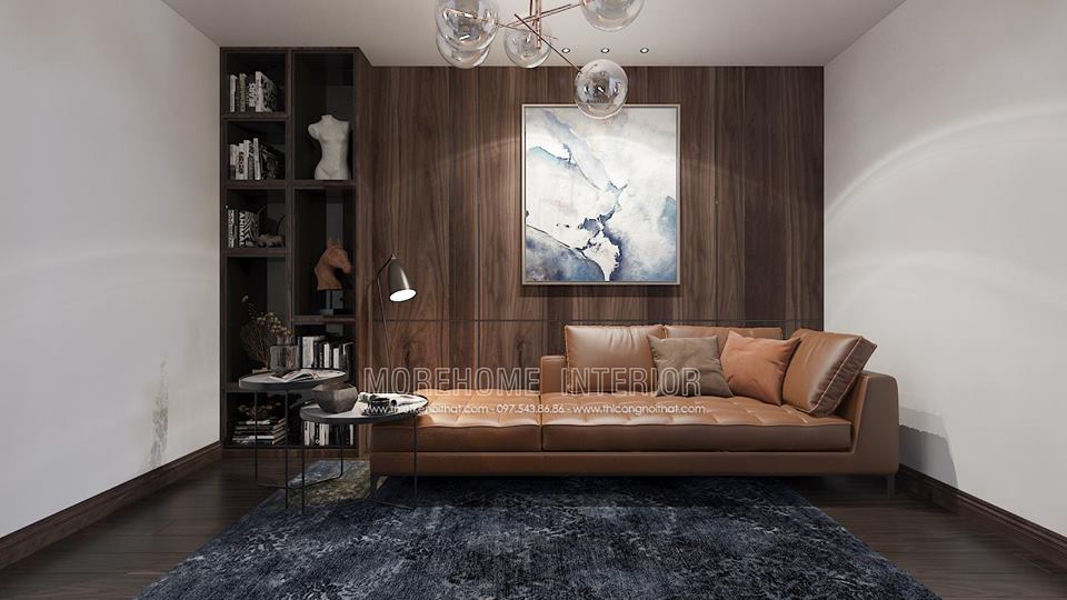 Phòng khách ngay cửa ra vào được thiết kế hiện đại, sang trọng với bộ sofa da chữ L màu trắng. Chiếc bàn trà chân gỗ mặt kính cũng mang đến vẻ tinh tế cho không gian phòng khách. Mảng tường đối diện bộ sofa được ốp đá nhân tạo LG cao cấp do Morehome cung cấp, xung quanh được ốp gỗ veneer cao cấp tạo nên điểm nhấn nhất định cho không gian phòng khách. Phía sau bộ sofa là mảng tường ốp gỗ được trang trí bởi những bức tranh họa tiết nhằm giải quyết sự trống trải cho mảng tường và giúp không gian phòng khách sinh động hơn.