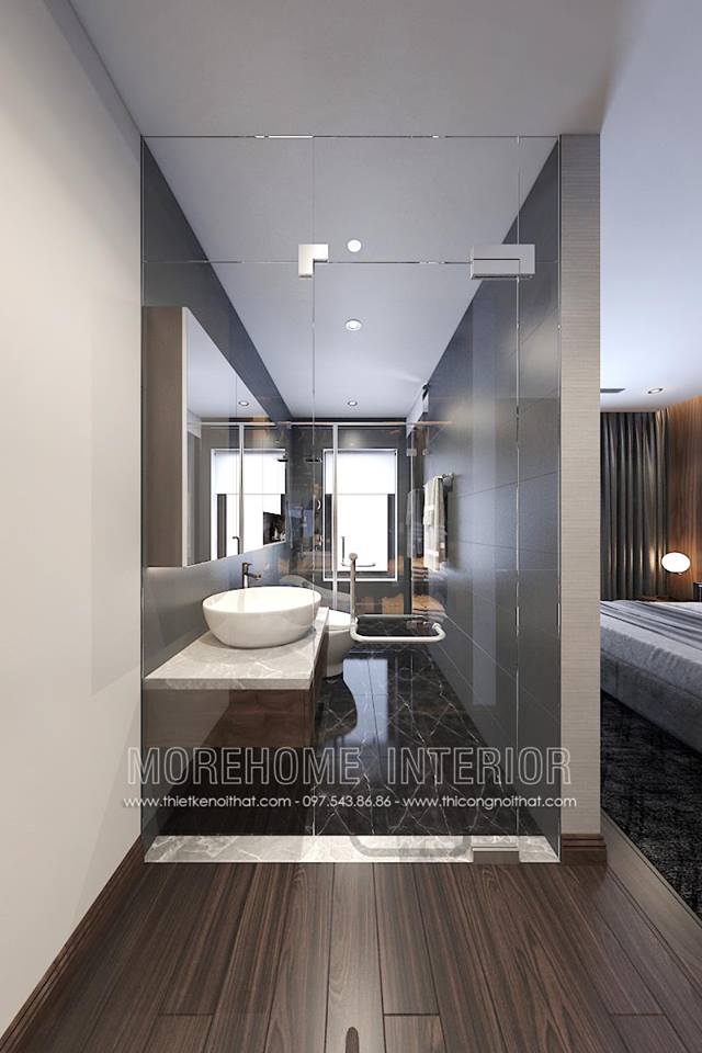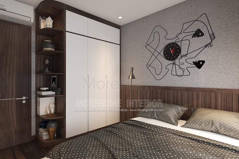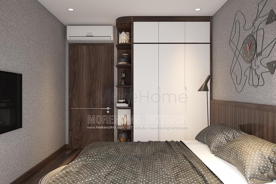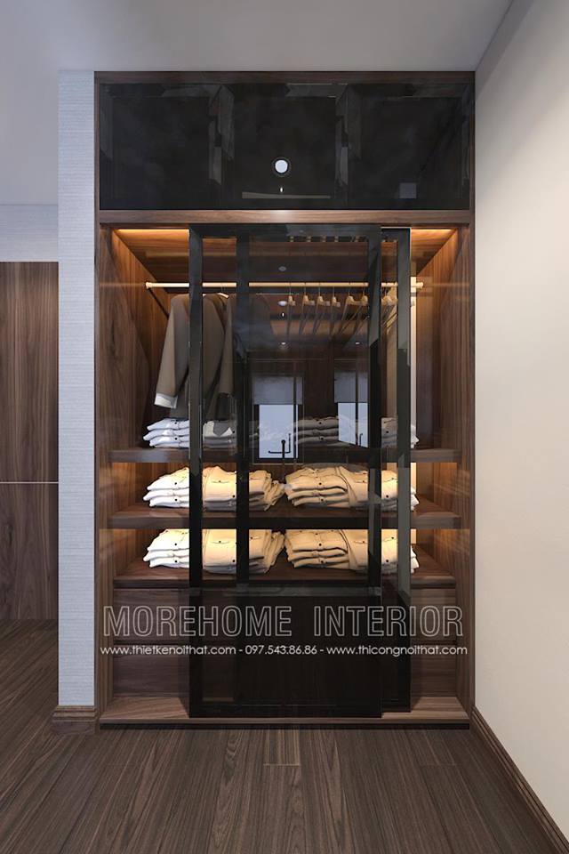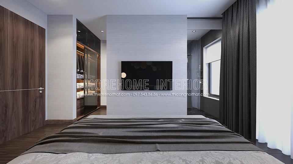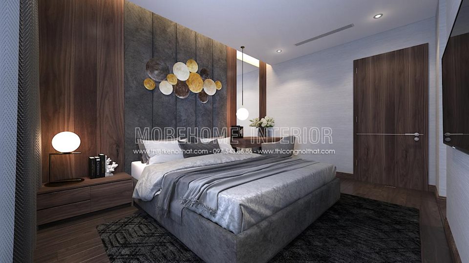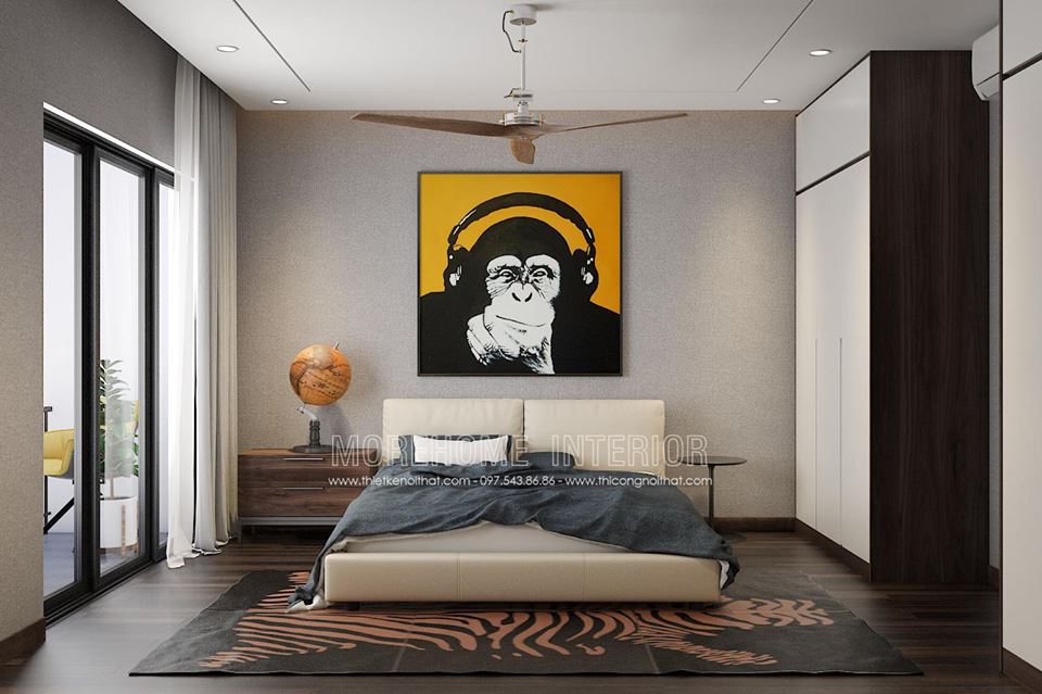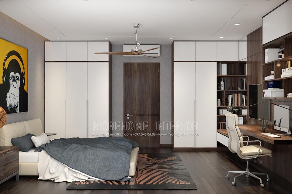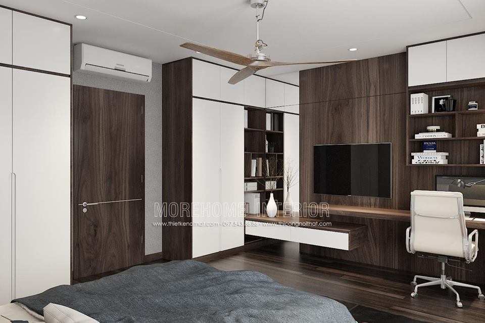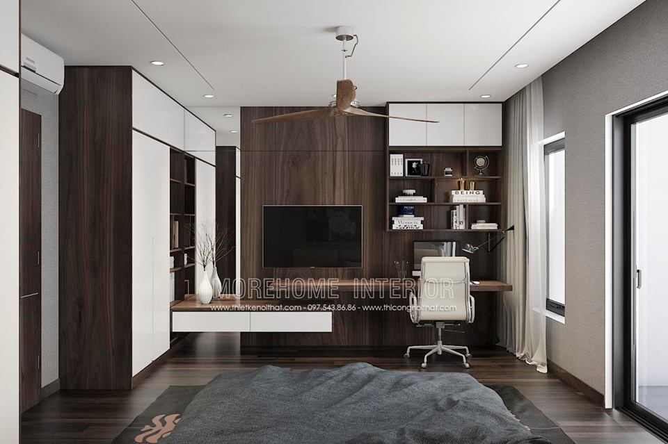 Thiết kế nội thất biệt thự liền kề chất liệu gỗ công nghiệp thì không gian phòng ngủ cũng được sử dụng chất liệu gỗ này. Phòng ngủ Master được thiết kế khép kín với phòng tắm và phòng thay đồ ở trong khuôn viên phòng ngủ. Không gian nghỉ ngơi được thiết kế đơn giản với chiếc giường bọc nỉ đầu giường và mảng tường được ốp gỗ đầu giường. Bàn trang điểm cũng làm bằng gỗ công nghiệp hiện đại kết hợp với chiếc gương trang trí hình vuông lớn. Phòng thay đồ và phòng tắm được ngăn các bởi một bức tường. bên phải gần cửa sổ là phòng tắm với đầy đủ tiện nghi. Bên tay trái là phòng thay đồ, sử dụng hệ tủ đồ mở âm tường với gỗ công nghiệp kết hợp của kính trượt cao cấp, sang trọng.