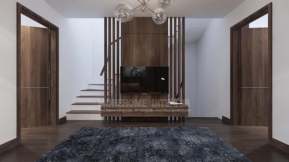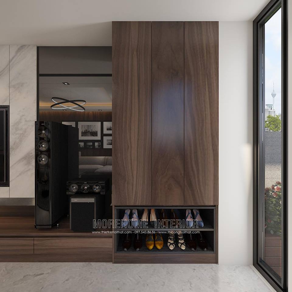 Là căn biệt thự sử dụng hoàn toàn gỗ công nghiệp An Cường vì thế cho nên khi bước chân vào ngôi nhà đập vào mắt bạn sẽ là những mẫu đồ nội thất bằng gỗ công nghiệp như mẫu tủ đựng giày dép, túi xách, kệ đựng loa đài,… được làm bằng gỗ veneer óc chó cao cấp với đường vân và màu sắc giống như gỗ óc chó.