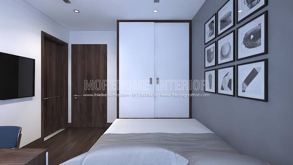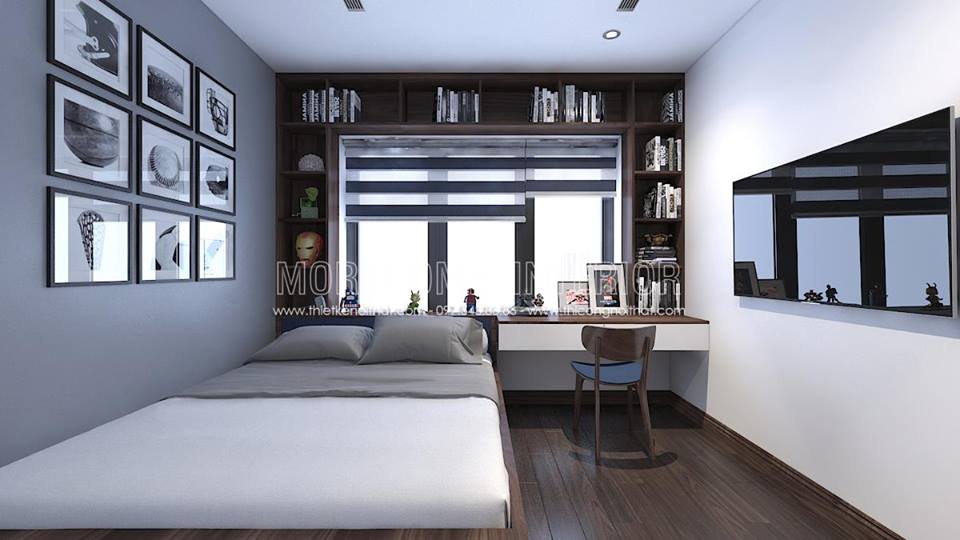 Thiết kế nội thất phòng ngủ con năng động sáng tạo. Đồ nội thất gỗ công nghiệp được đặt trong phòng ngủ con được KTS bố trí sáng tạo bên cửa sổ thành một khuông vuông bao quanh cửa kính giúp cho con bạn có được không gian học tập và khám phá thế giới bên ngoài. Bàn học gắn liền với tab đầu giường và kệ trang trí thành một chuỗi ô tiệc ích và tiết kiệm không gian. Cuối chân giường là hẹ thống tủ quần áo cửa trượt giúp cho việc tiết kiệm không gian khi đóng mở cửa. Phòng tắm cũng được đặt ngay trong phòng ngủ giúp cho con bạn có được sự thư giãn riêng tư của mình.