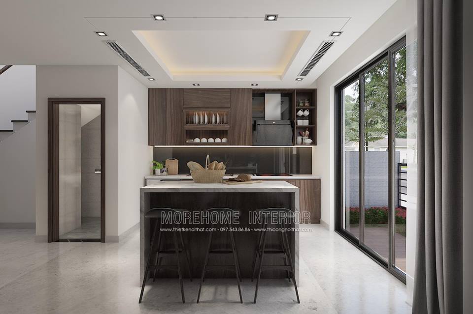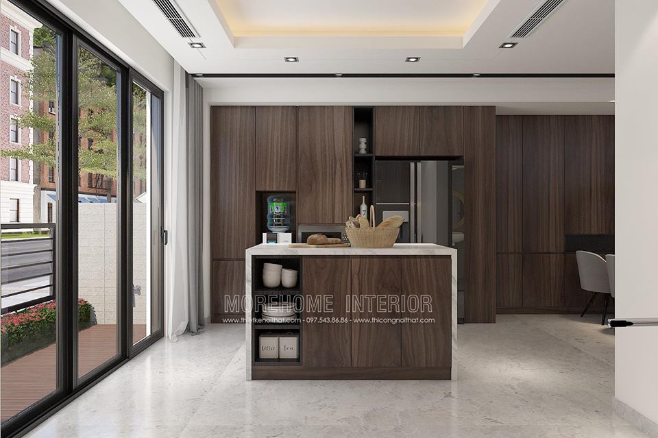 Vào trong cùng nữa là không gian phòng bếp cao cấp đày đủ tiện ích. Phòng bếp được thiết kế hầu hết các mảng tường đều ốp gỗ công nghiệp và hệ thống tủ bếp cũng vậy đều một chất liệu gỗ với đường vân và màu sắc như nhau. Điểm nhấn của không gian nội trợ là chiếc đảo bếp hay là quầy bar được thiết kế tinh xảo, chanh xả với đá nhân tạo LG cao cấp, bên cạnh được đặt 2 chiếc ghế bar cao tạo nên không gian trưng bày đồ ăn tuyệt vời cho người nội trợ. Không gian bếp được đặt bên cạnh của sổ bằng kính lại càng mang đến sự sang chảnh, thông thoáng cho người nội trợ.