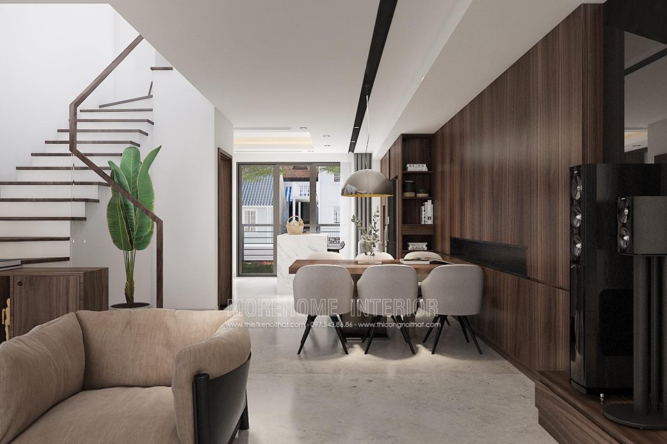 Đi thẳng vào trong là không gian phòng ăn, phòng ăn được thiết kế với bộ bàn ghế ăn 6 người được đặt bên cạnh cầu thang và bên cảnh mảng tường được ốp gỗ công nghiệp An Cường. Một chiếc đèn chụp hình tròn giúp cho không gian ăn uống thêm lãng mạn và tiện nghi.