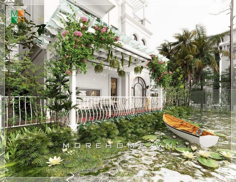 Trên phần sân vườn rộng của nó, mẫu thiết kế kiến trúc biệt thự, nhà phố màu trắng tinh tế và trẻ trung được nổi bật.