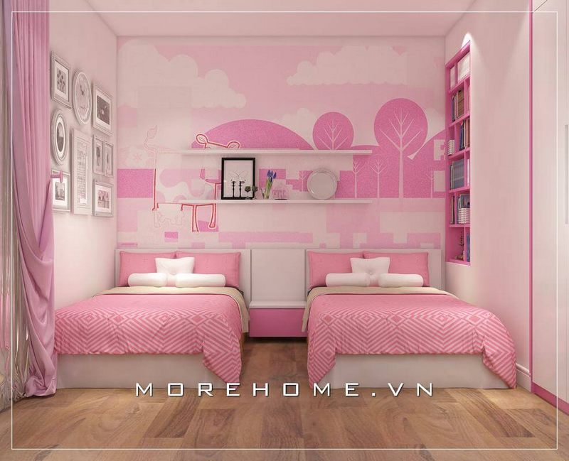 Giường ngủ gỗ công nghiệp với gam màu trắng hồng nhẹ nhàng, sang chảnh được thiết kế dạng bệt đầu giường với tab giúp tạo thêm không gian gọn gàng hơn và có ngăn nắp.