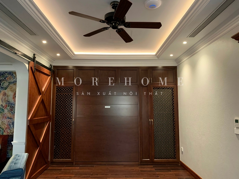 Việc thi công nội thất phòng ngủ trong biệt thự Ecopark được thực hiện với phong cách sang trọng, bao gồm một mẫu giường gỗ óc chó tân cổ điển cao cấp.